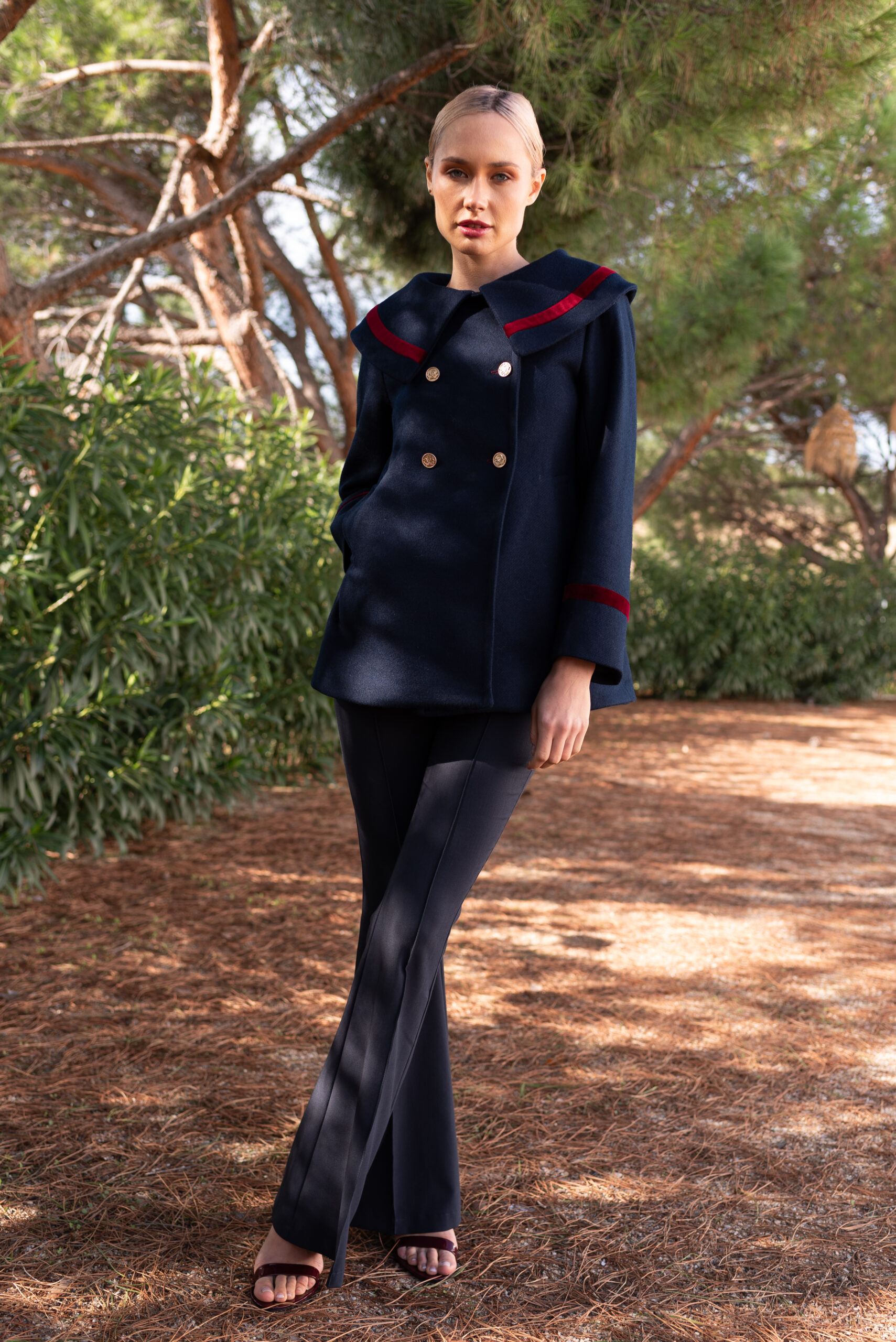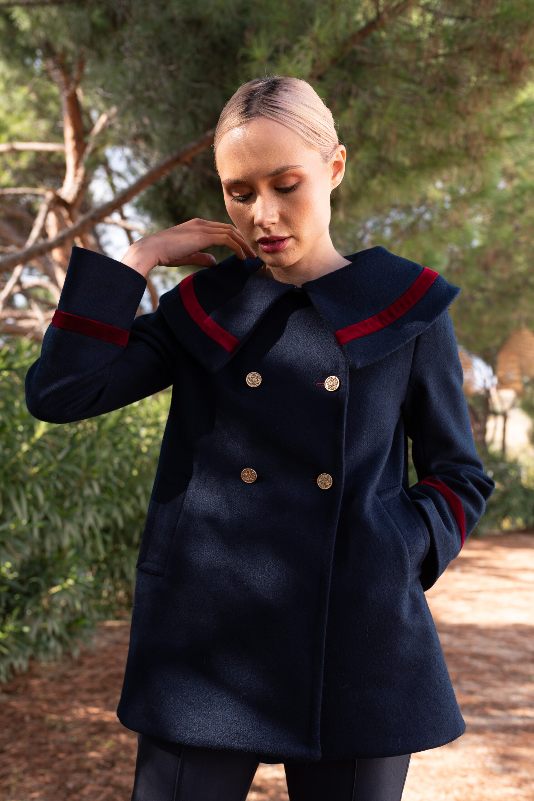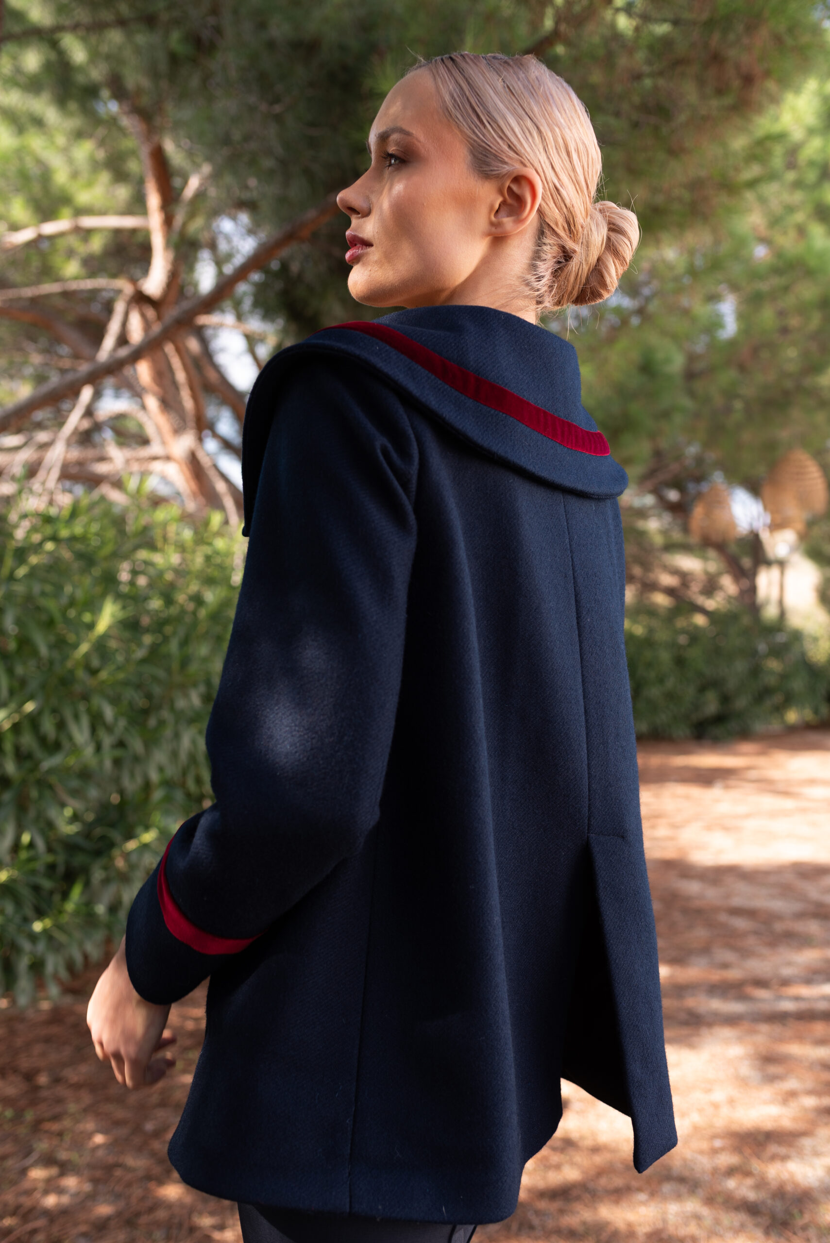 Doble botonadura en dorado con escudo antiguo y ojales ribeteados de burgundy. Bolsillos laterales y cierto vuelo en la espalda.