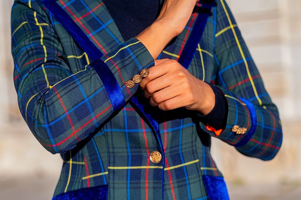 Nuestra blazer más vendida, realizada en cuadros escoceses con detalles en terciopelo azul eléctrico.