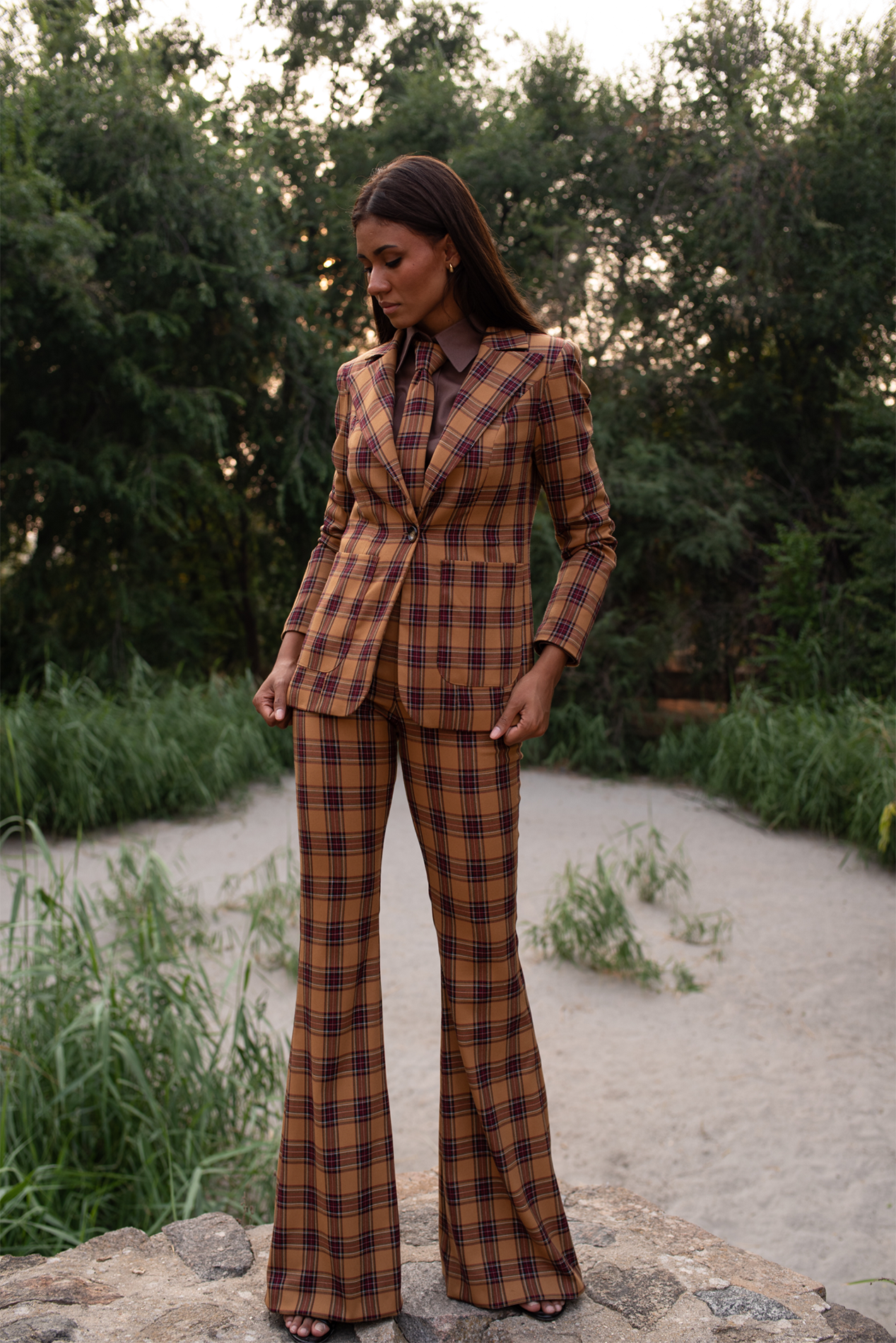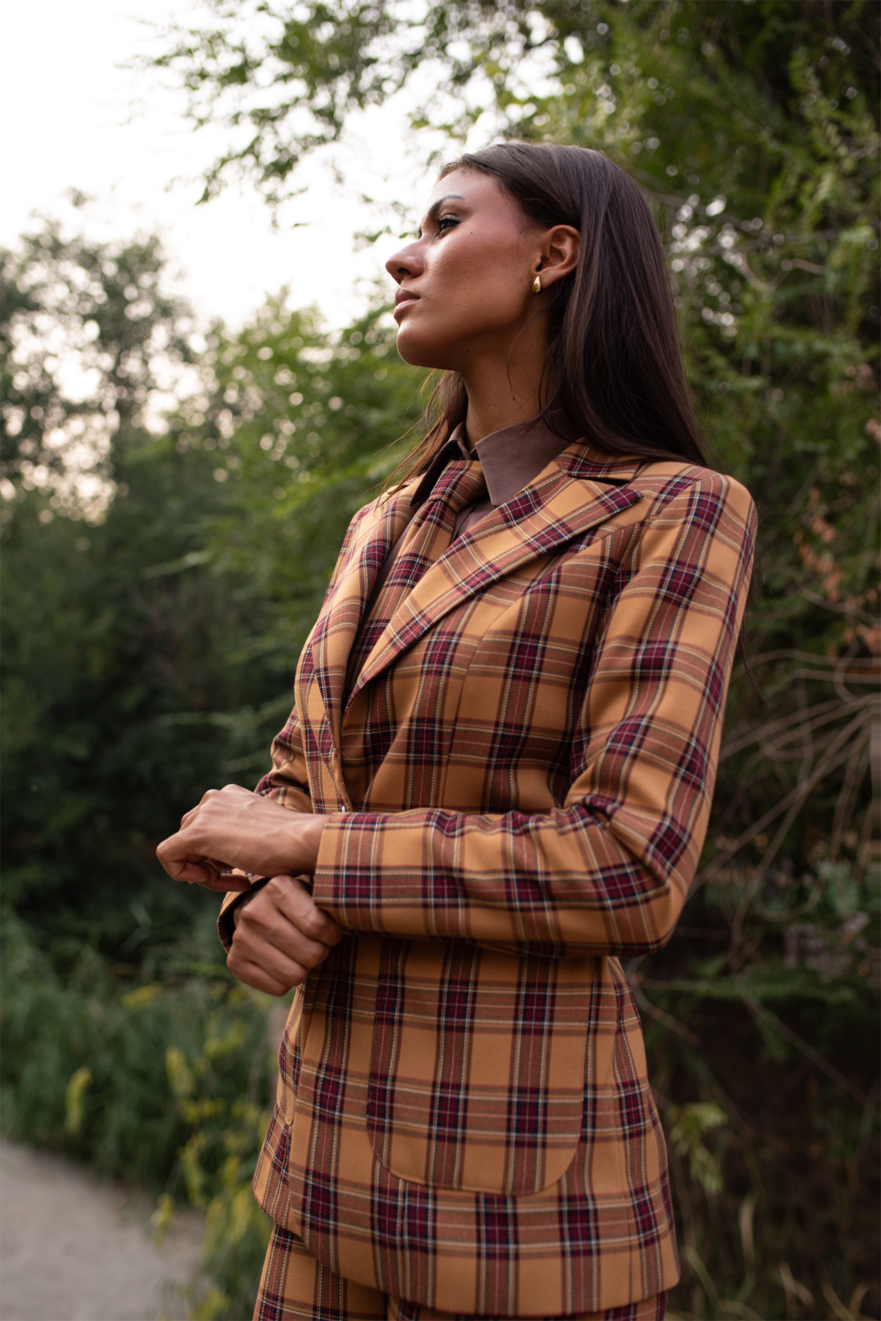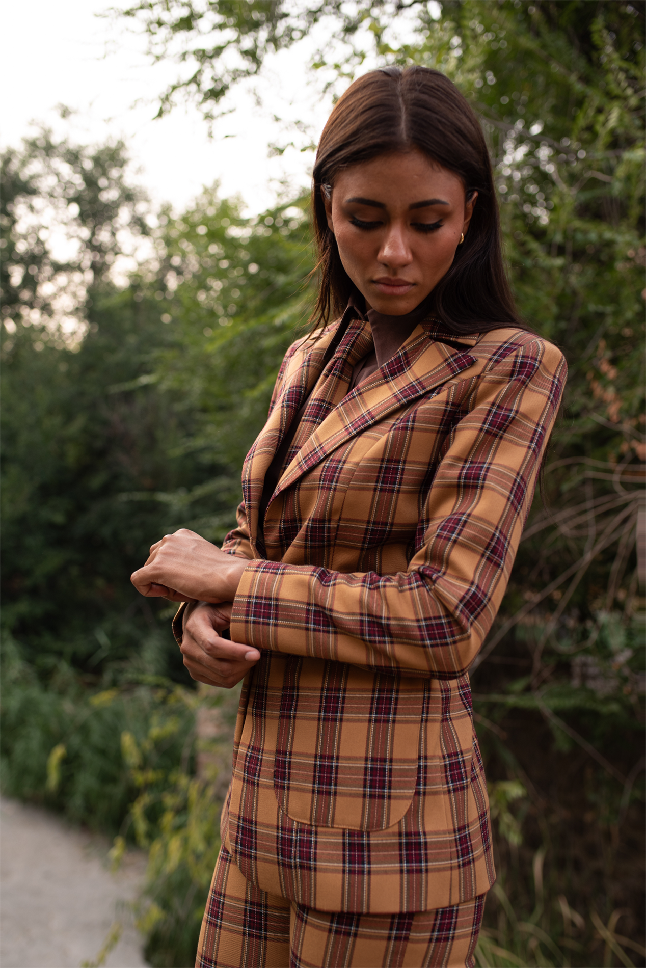 Blazer realizada en bonito tartán en tonos marrones y ocres, corte entallado con un solo botón.