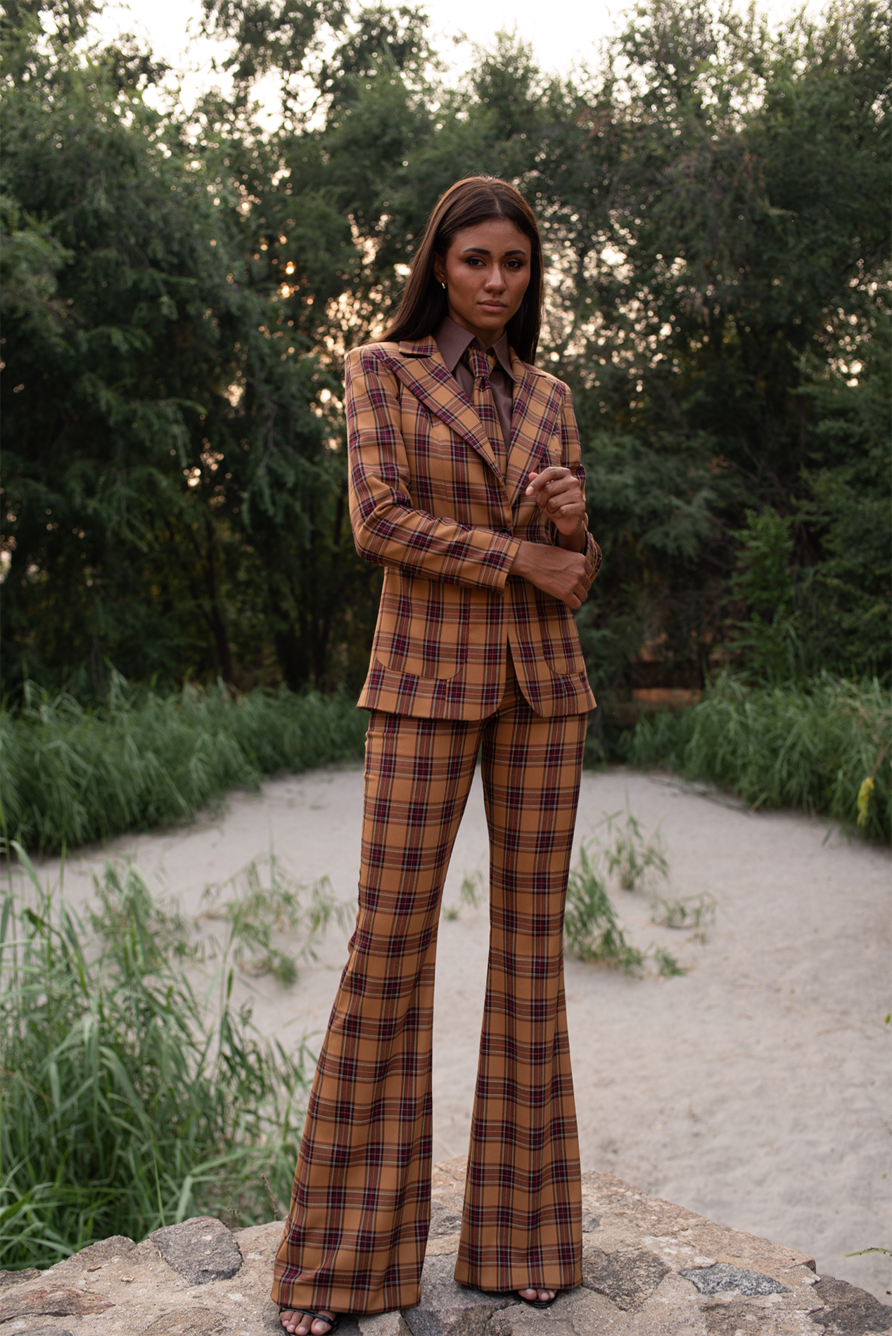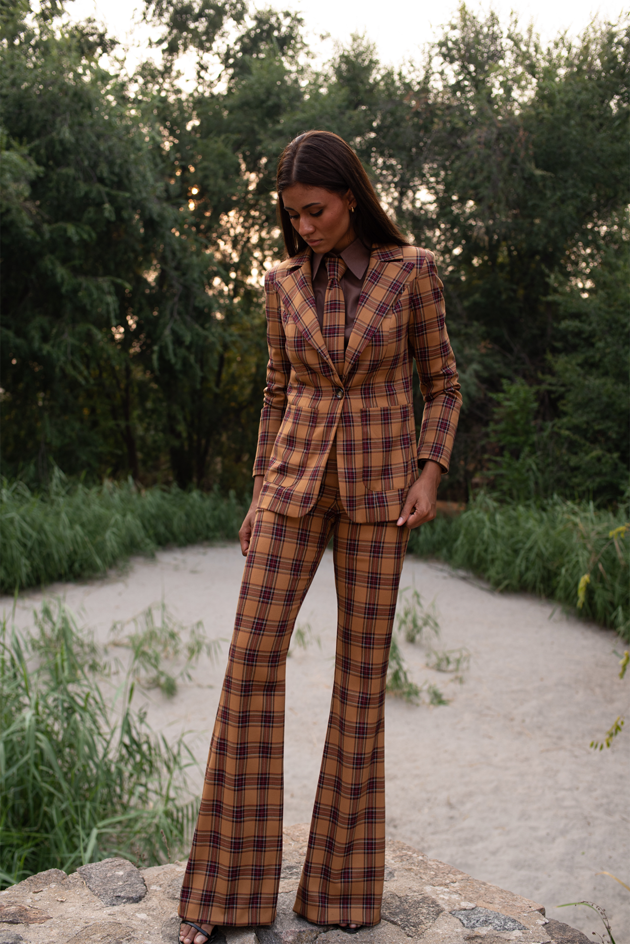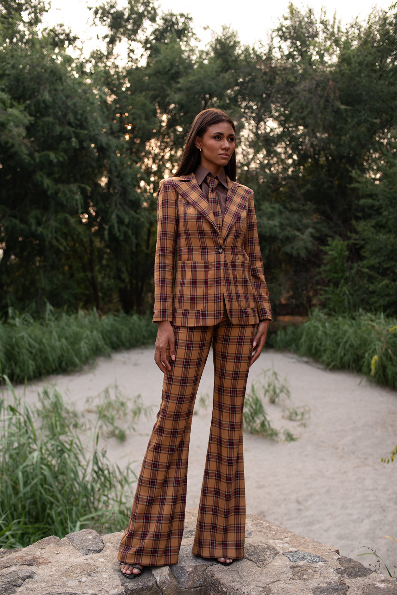 Blazer realizada en bonito tartán en tonos marrones y ocres, corte entallado con un solo botón.