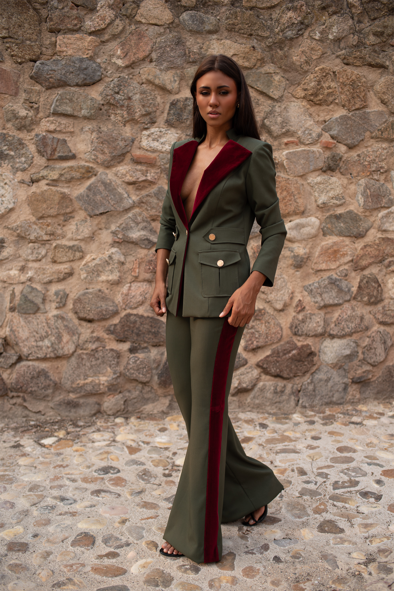 Blazer de estética militar realizada en tejidos de alta calidad, crep elástico verde oliva y terciopelo burdeos a contraste en grandes solapas.