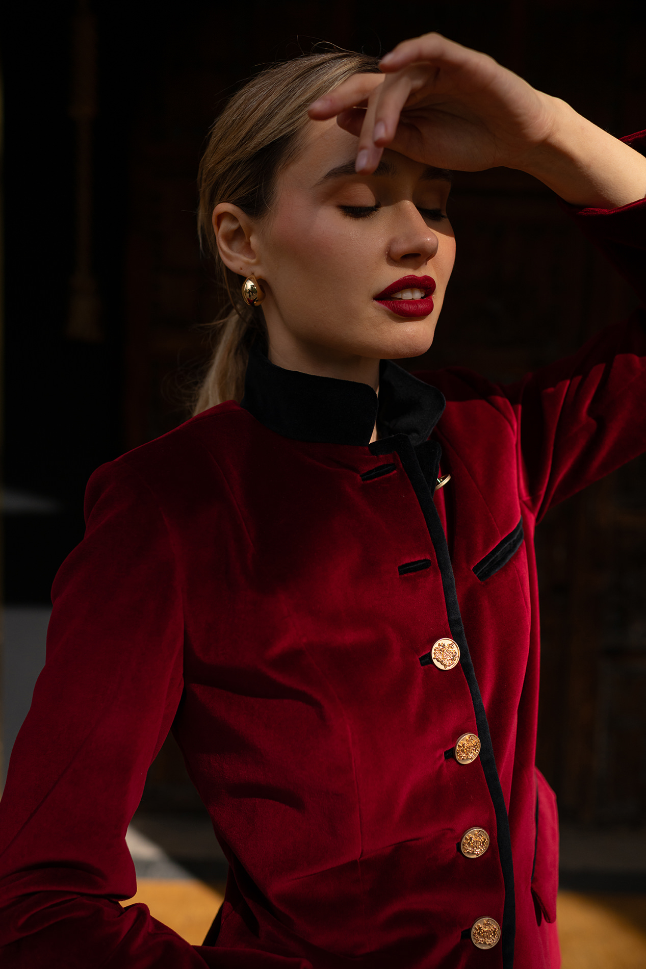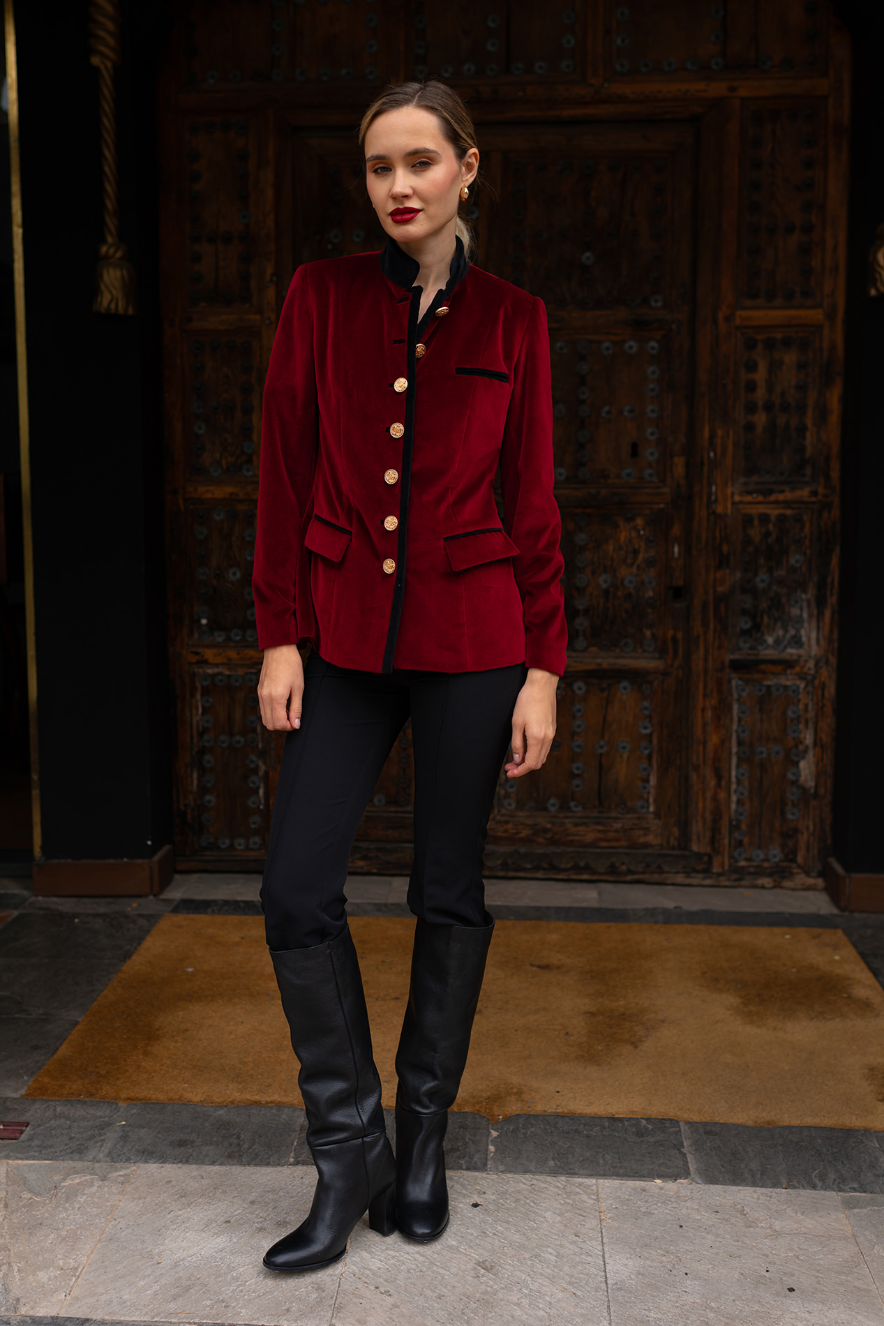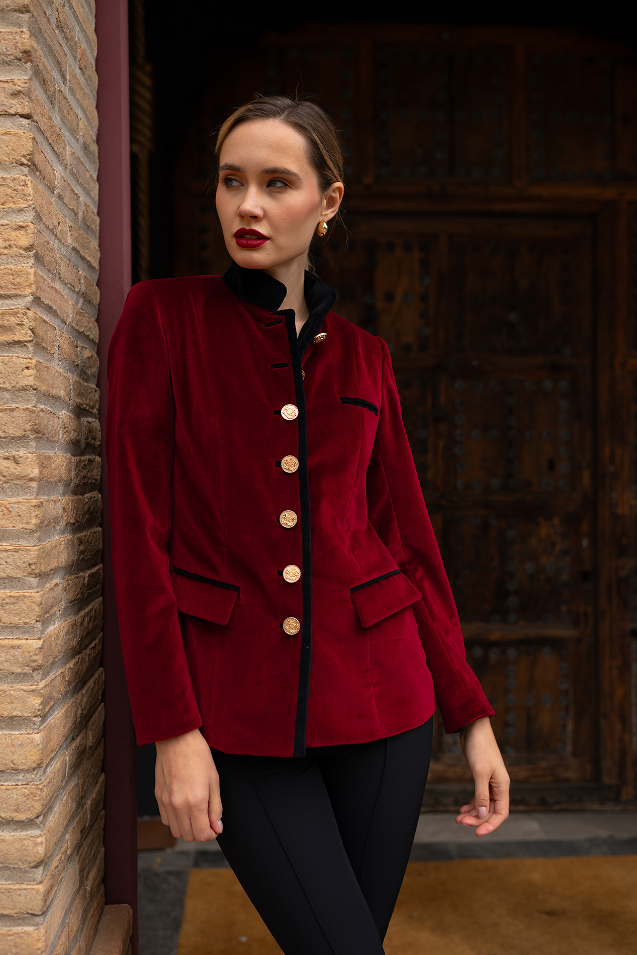 Cuello mao en terciopelo negro y detalles en bolsillos y ojales.