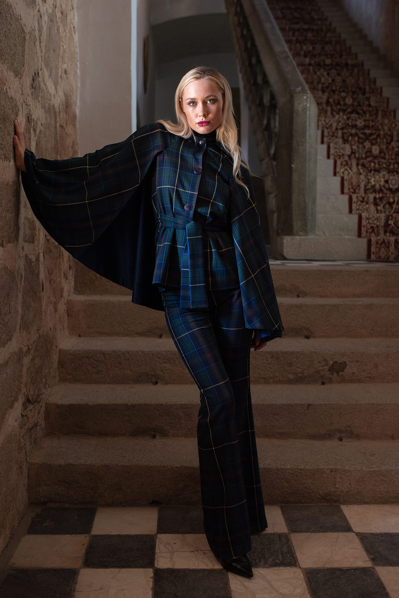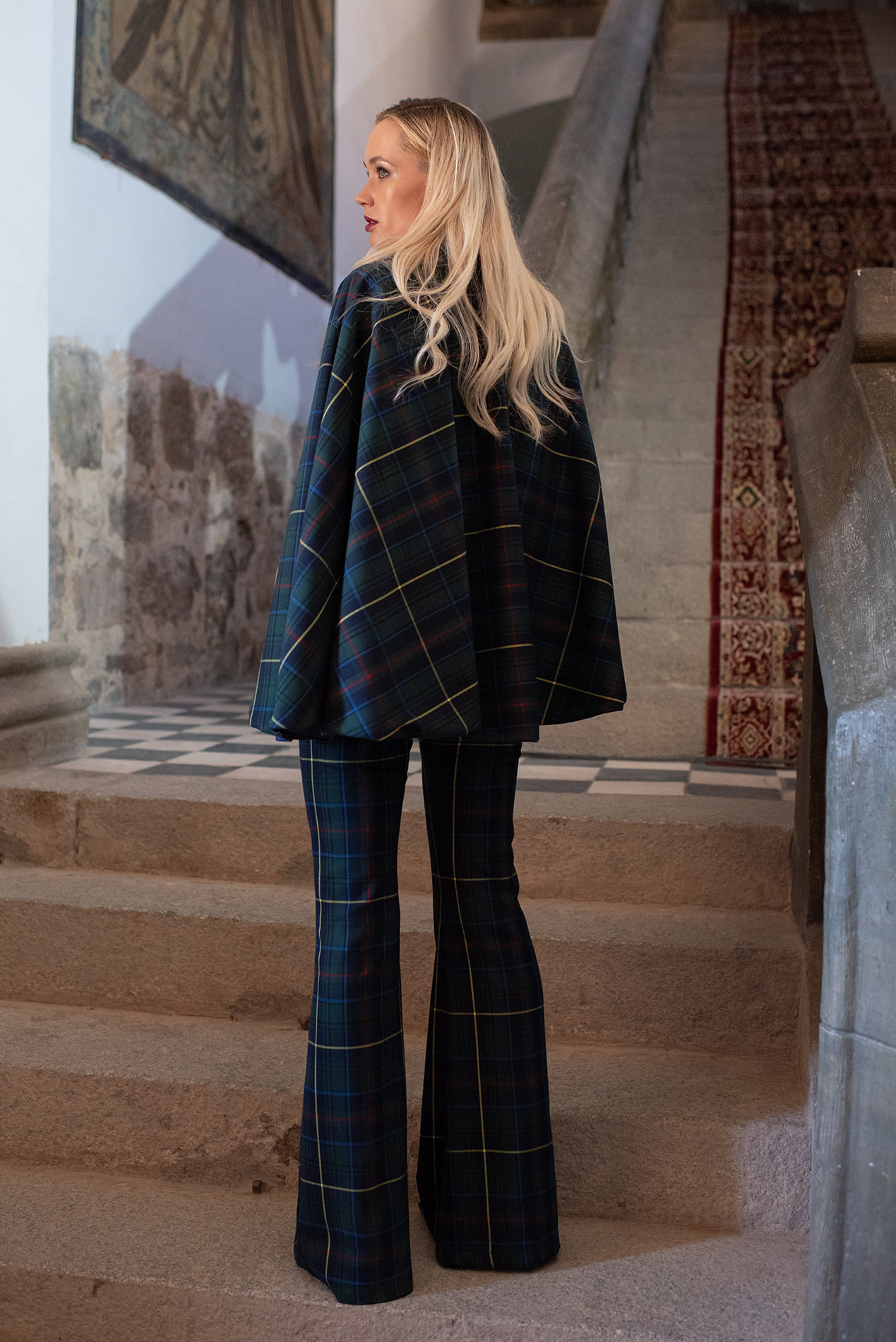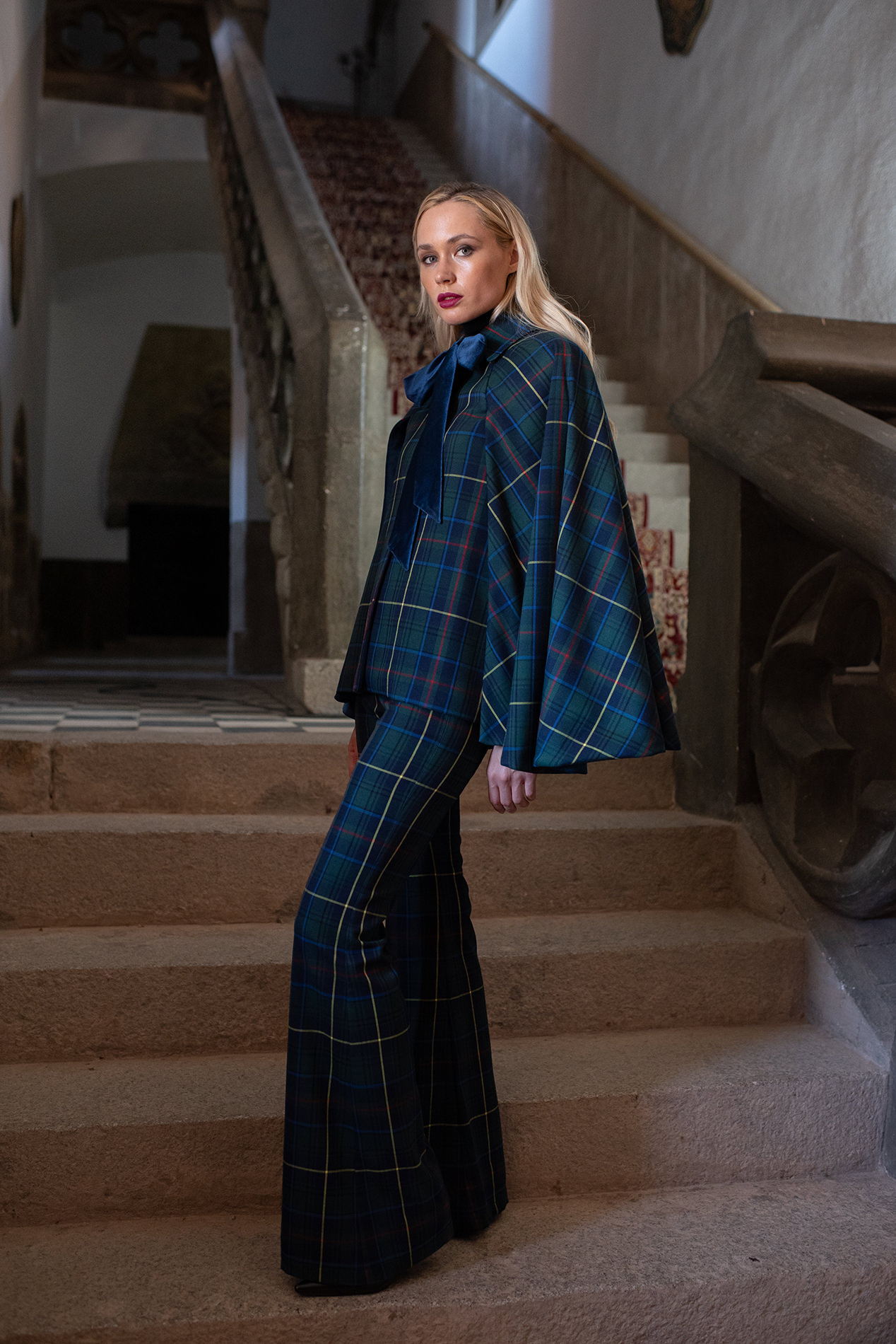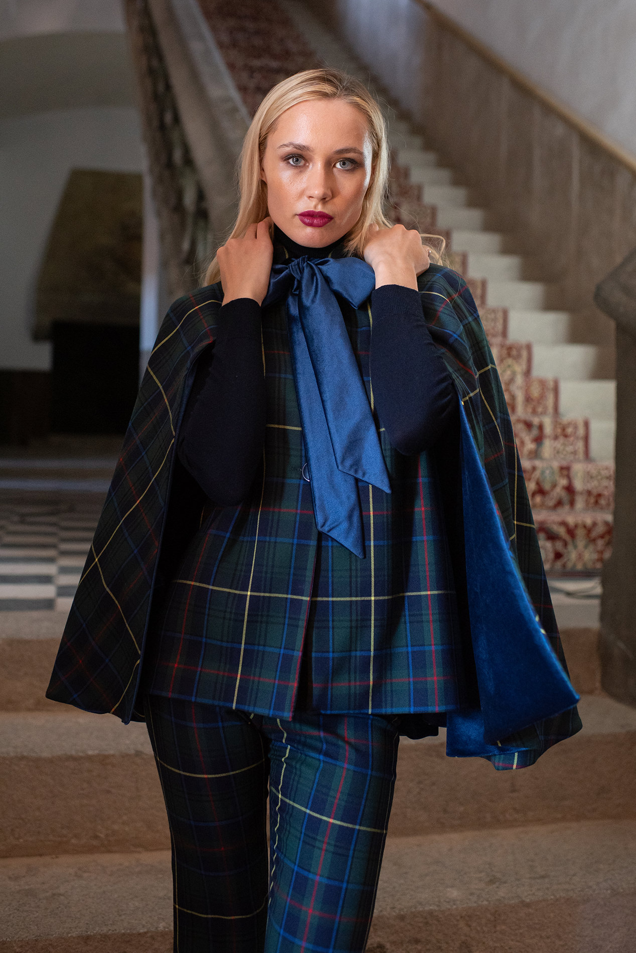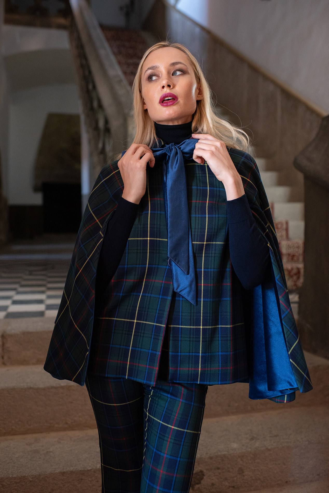 Realizada en tartán verde y azul es una prenda de lo más versátil ya que viene acompañada de cinturón de la misma tela para ceñir la cintura dándole un aire de lo más elegante y por lazo de terciopelo azul para llevarla con un aire de lo más chic.