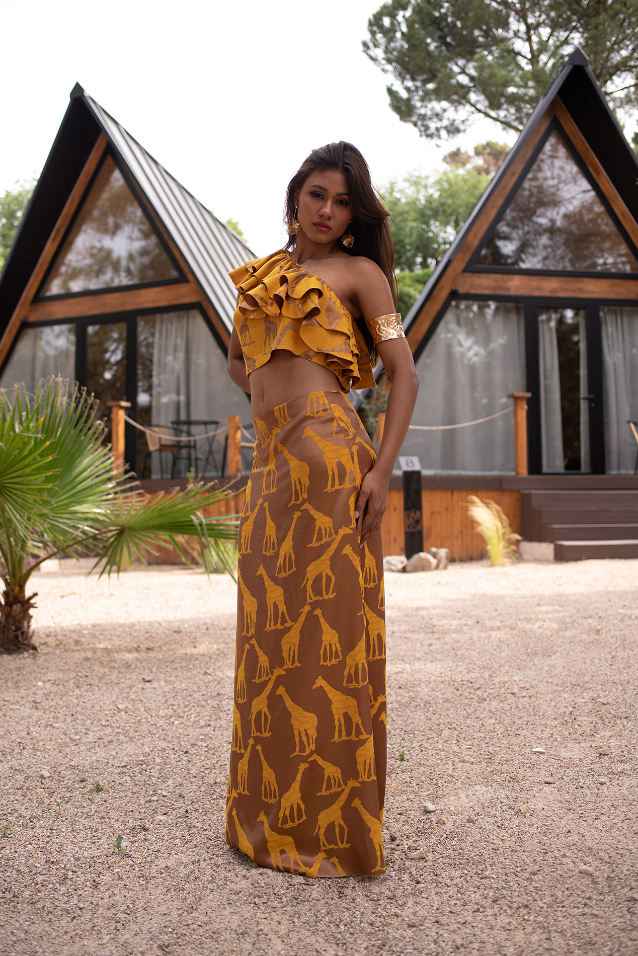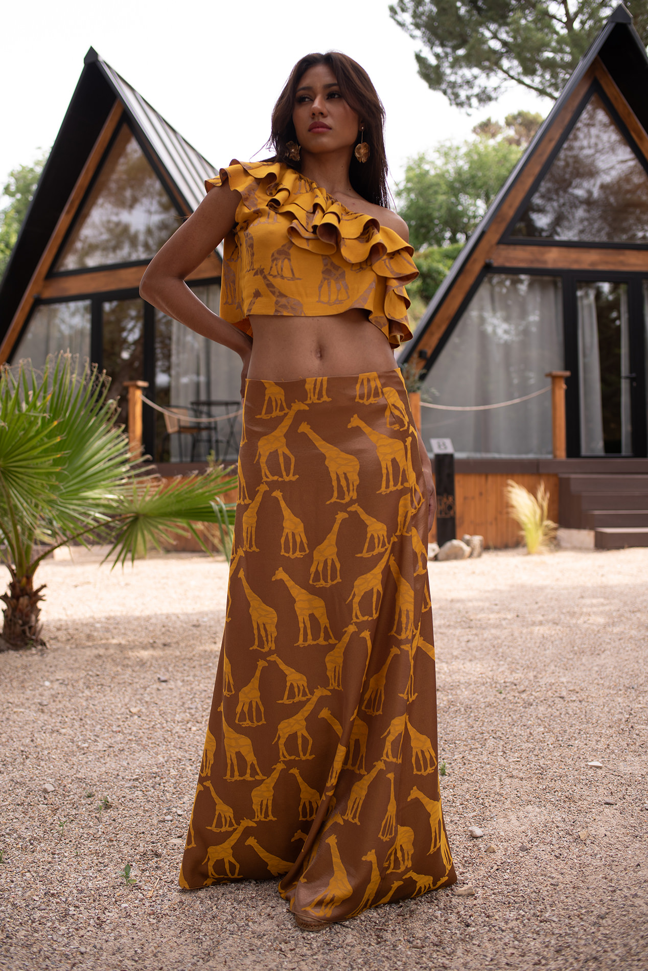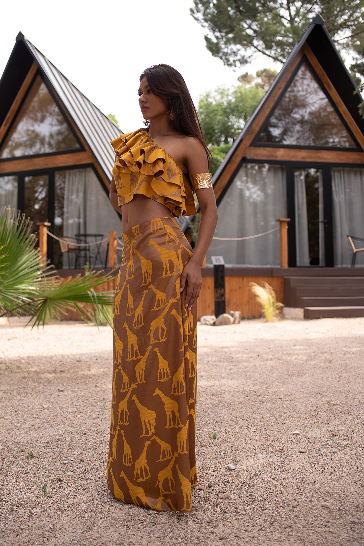 Conjunto formado por top asimétrico con volantes y falda larga ligeramente evasé en un espectacular y original tejido de jirafas combinando color oro y mostaza.