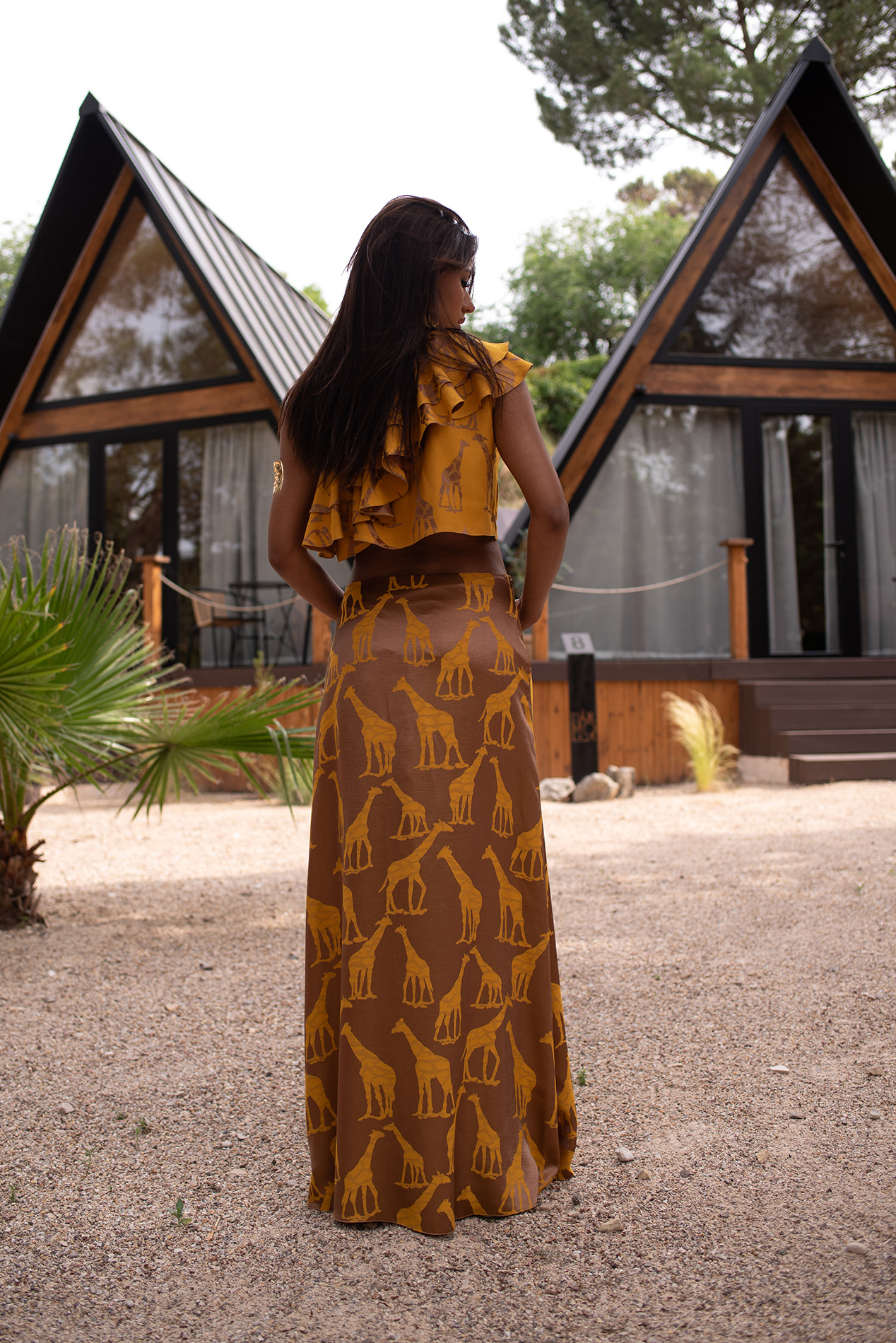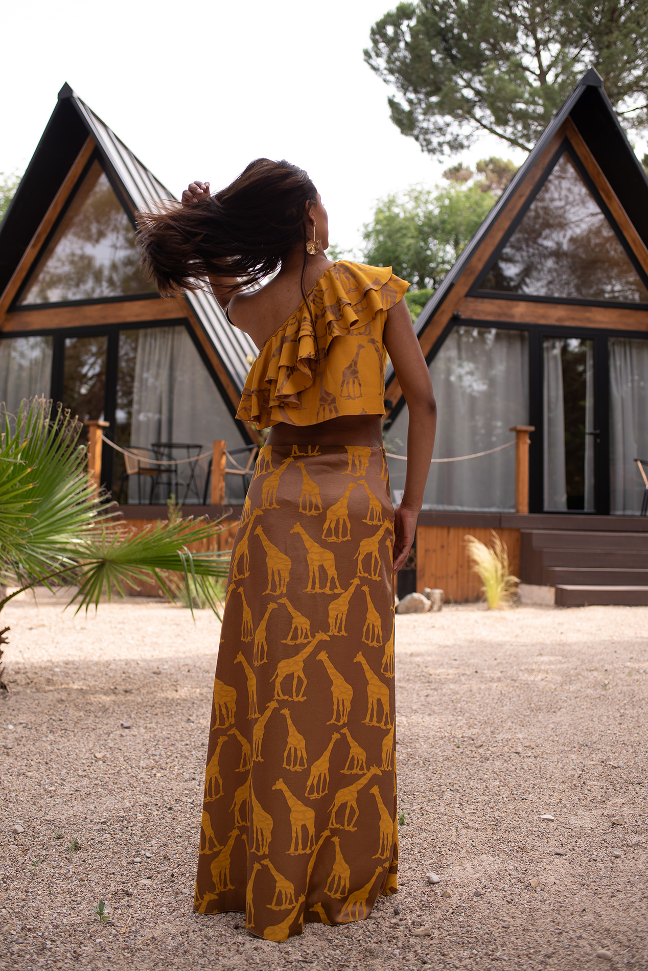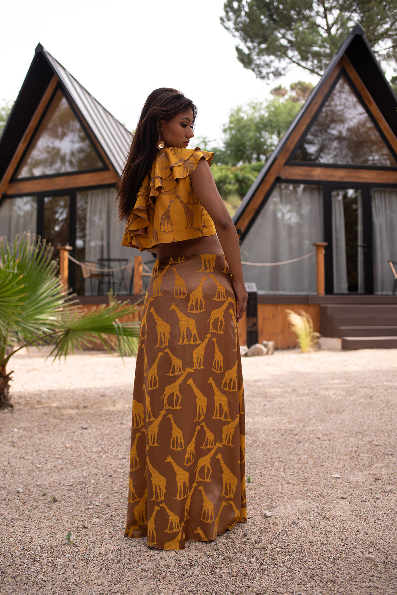 Conjunto formado por top asimétrico con volantes y falda larga ligeramente evasé en un espectacular y original tejido de jirafas combinando color oro y mostaza.