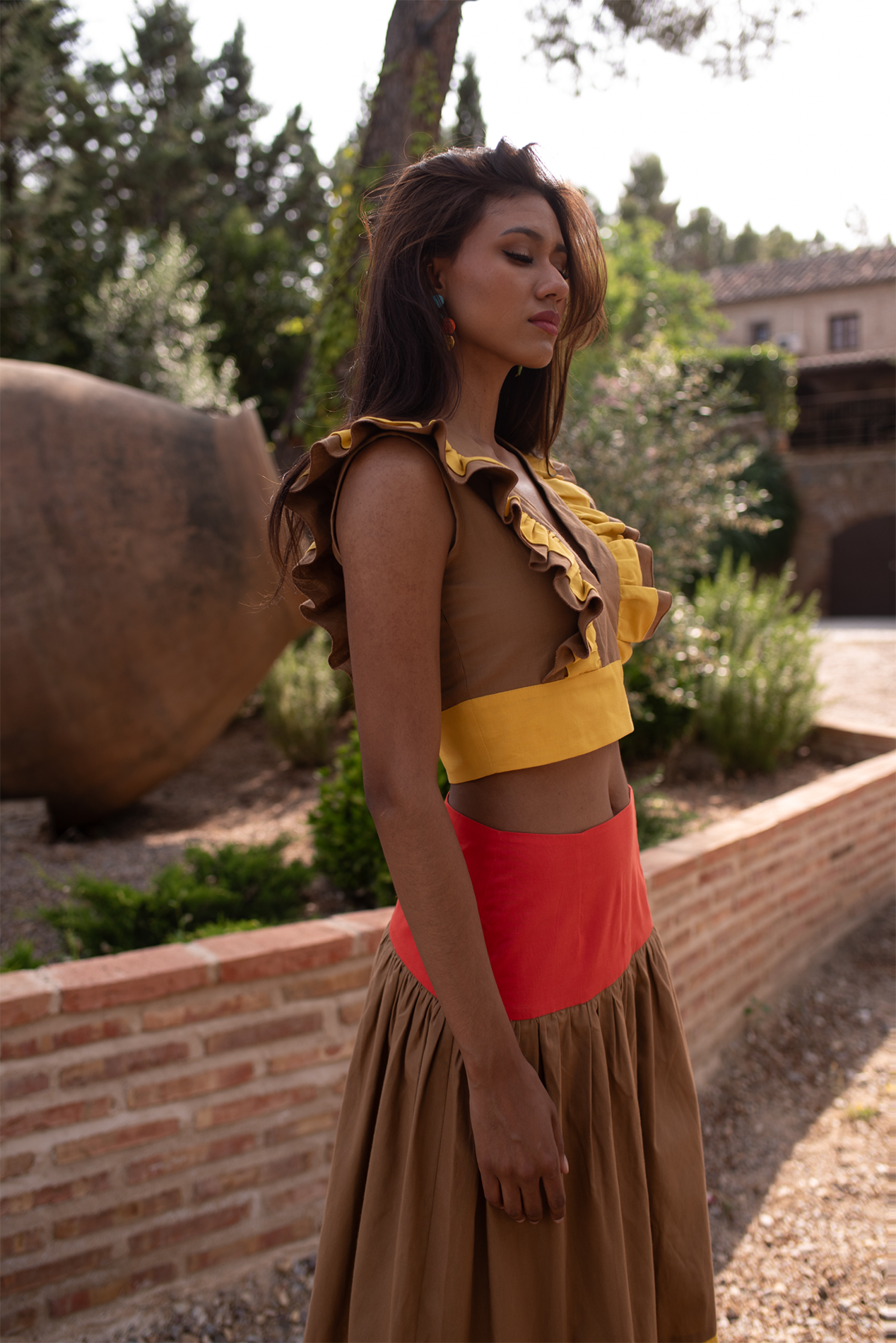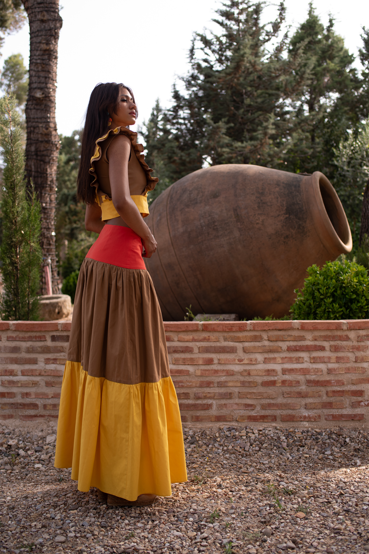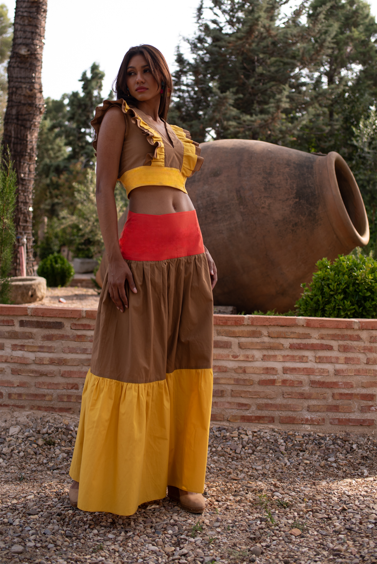 Conjunto formado por falda larga donde el amarillo, naranja y el arena se fusionan en una clara evocación a los colores del verano