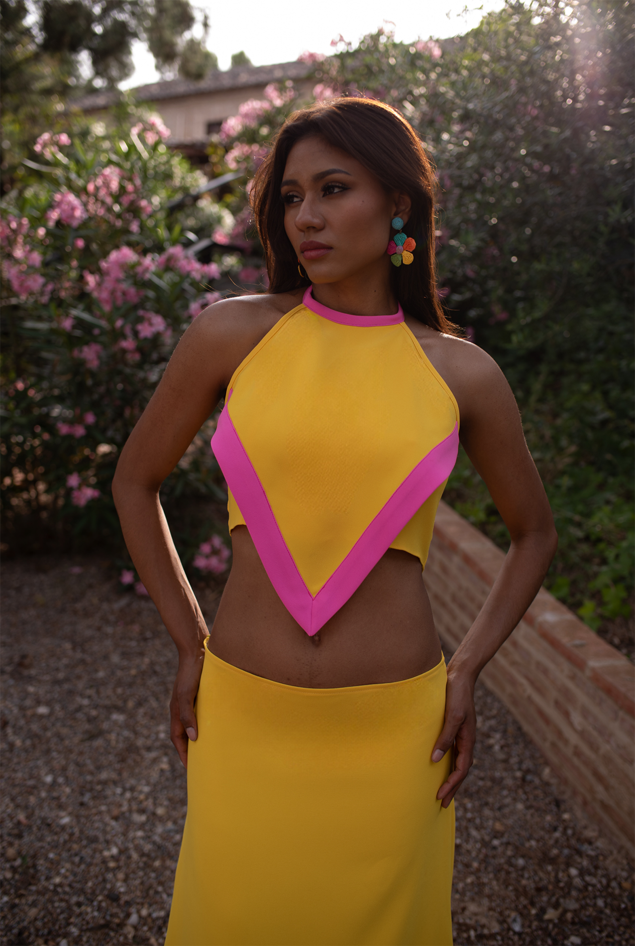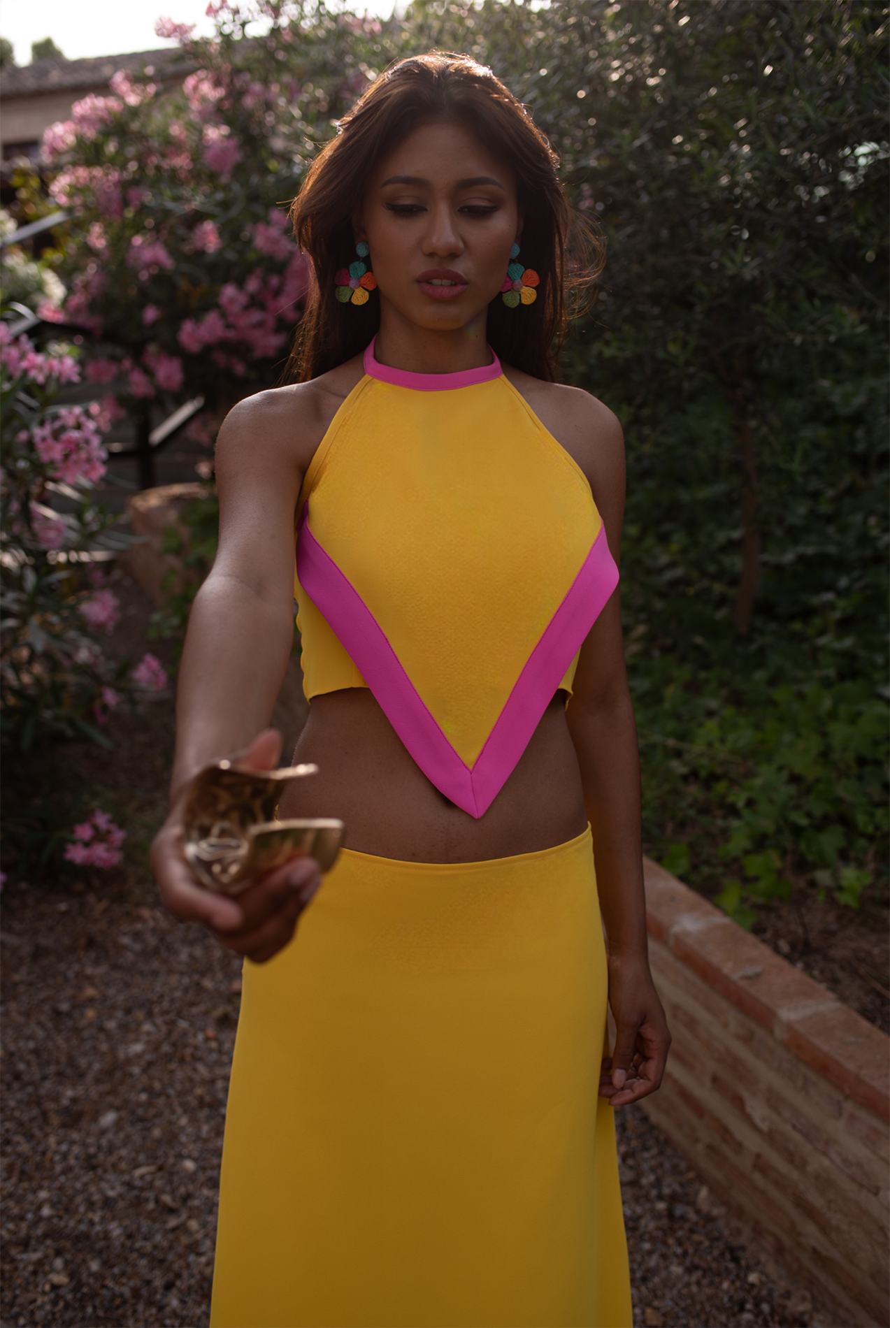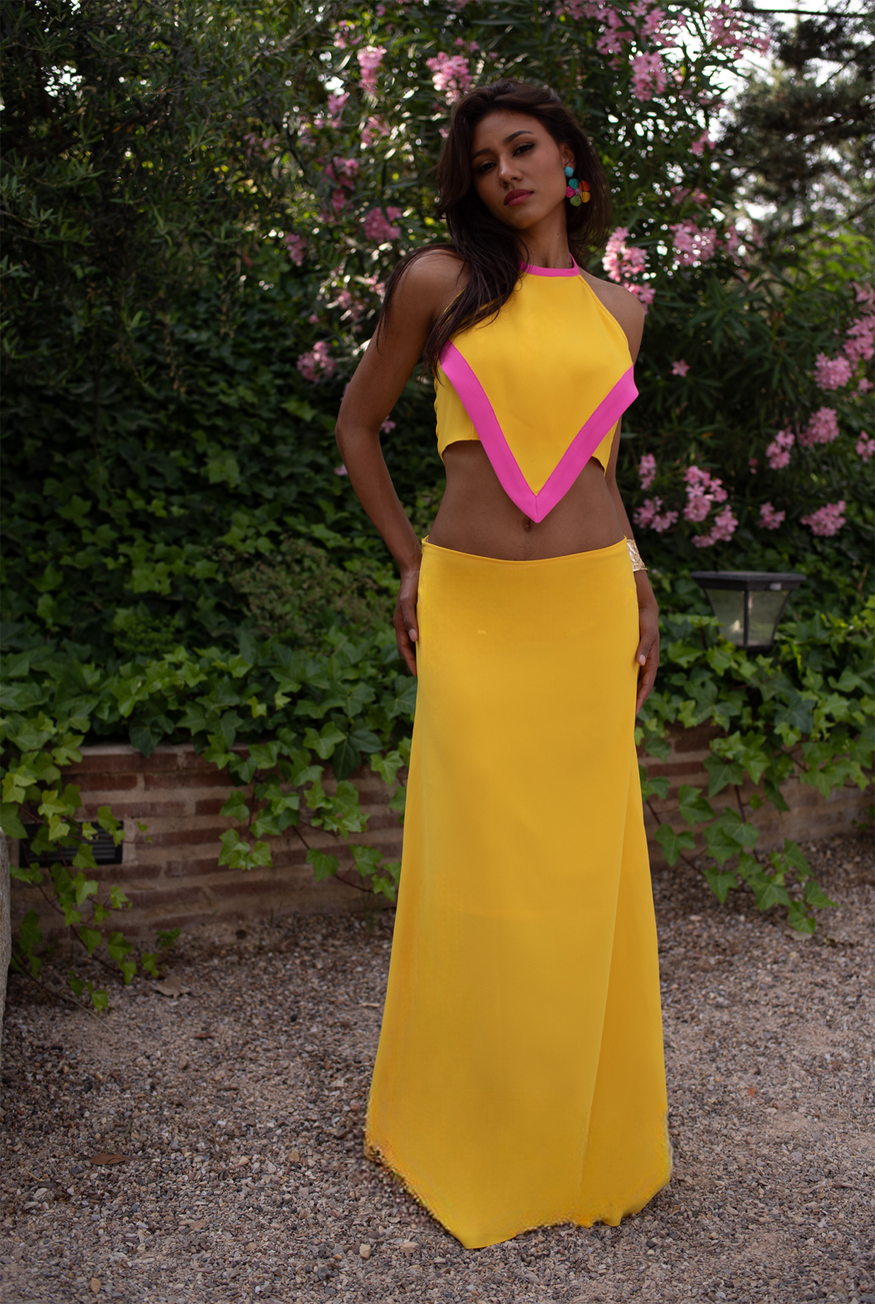 Conjunto de falda larga y evasé con cremallera invisible en un espectacular tejido amarillo