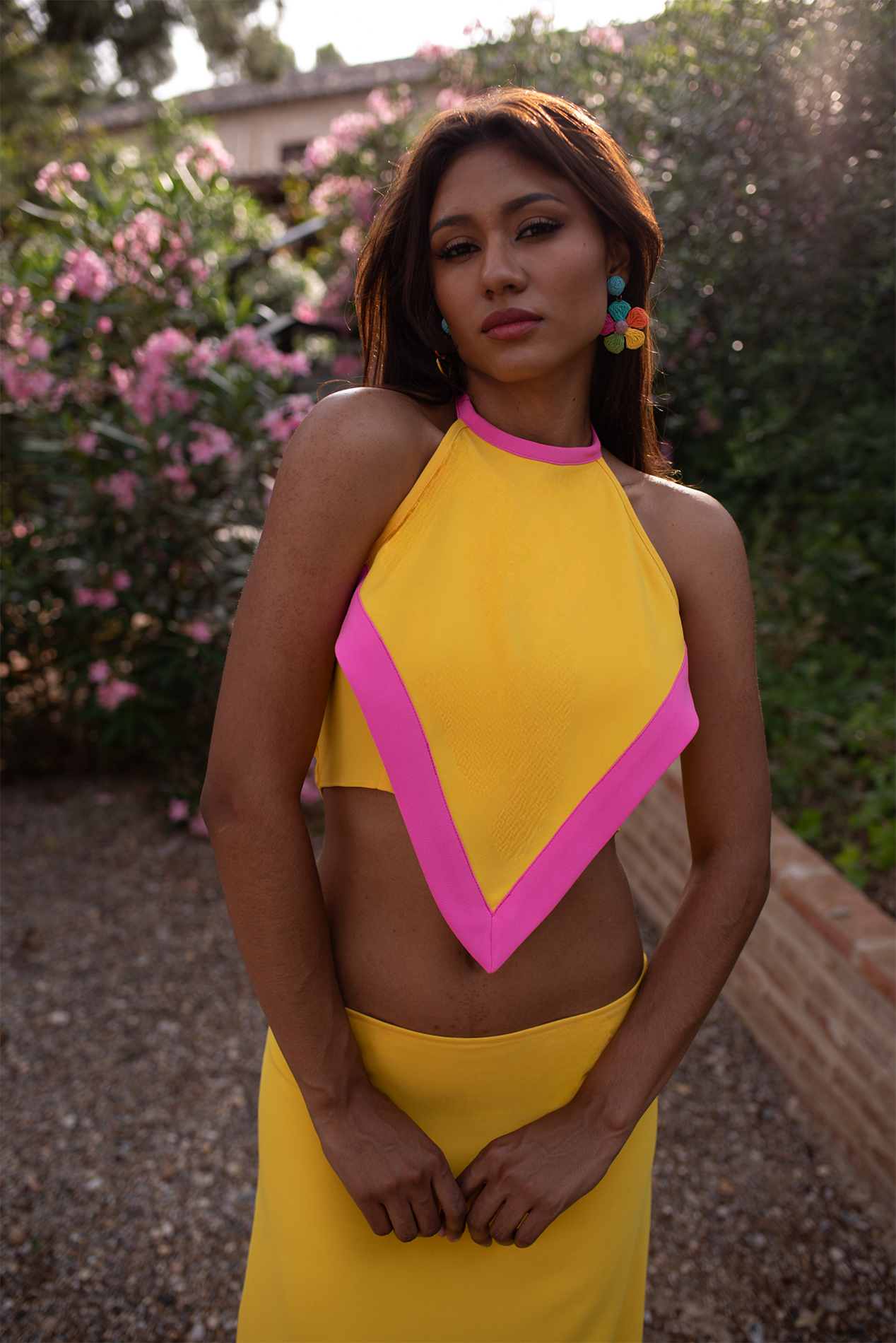 Doble top a juego estilo pañuelo bordeado de rosa fucsia, una opción vibrante para los días de playa que se convierten en largas noches.