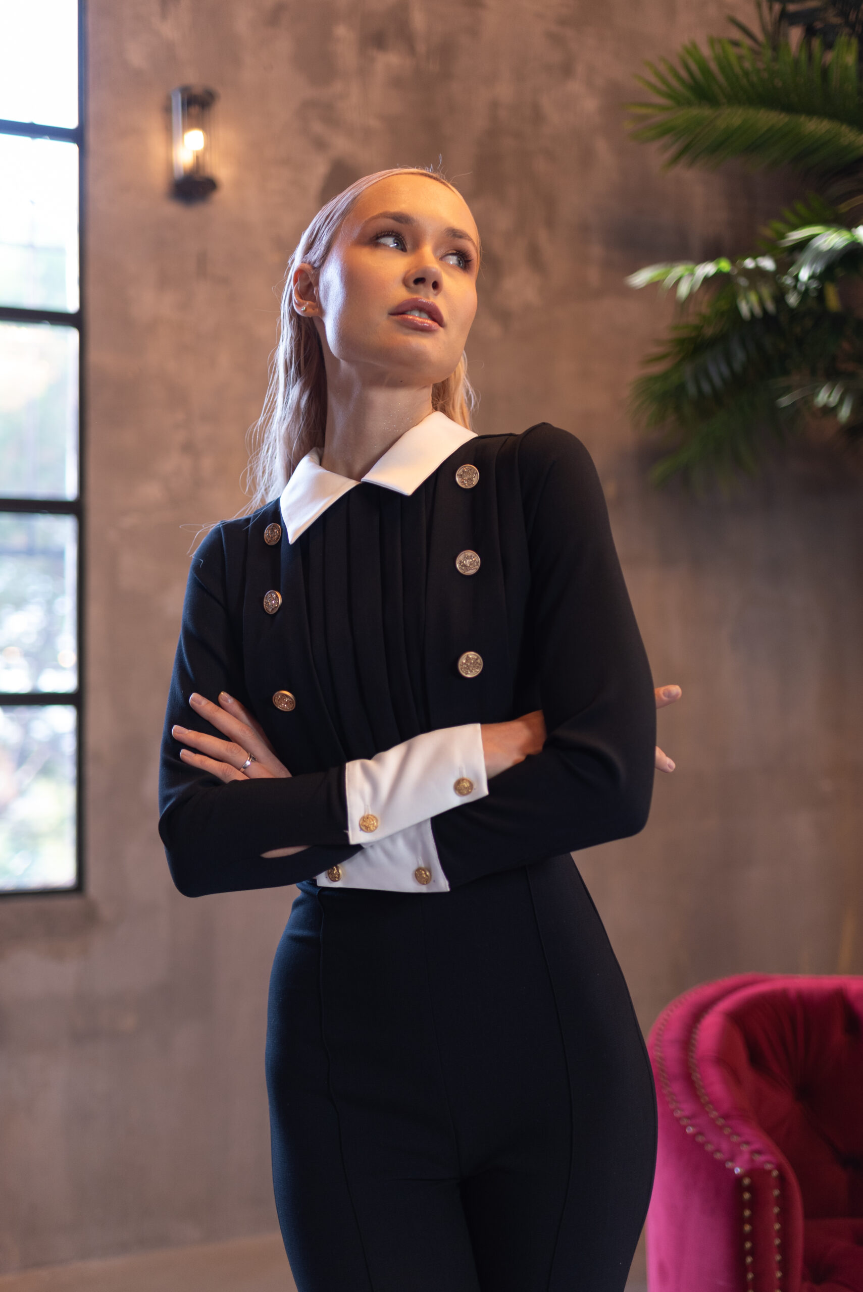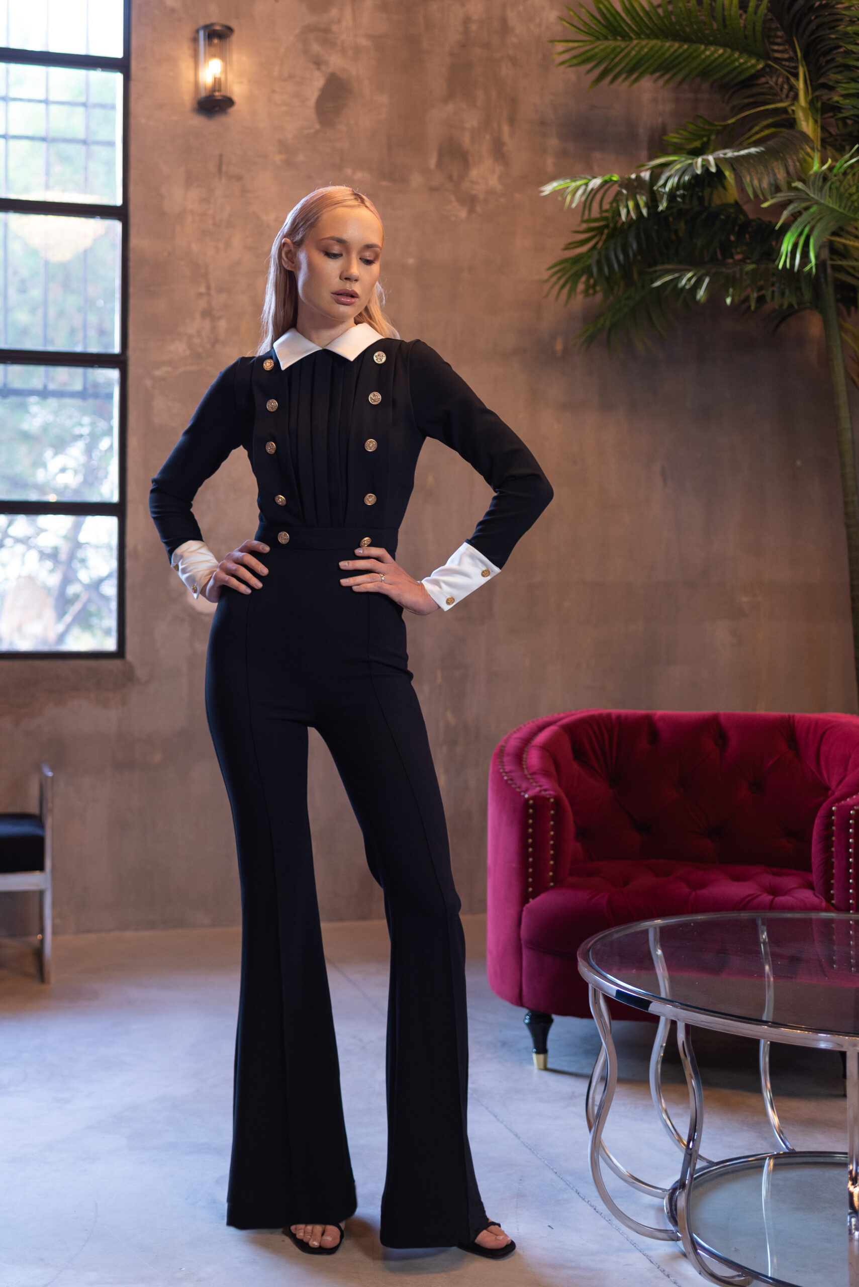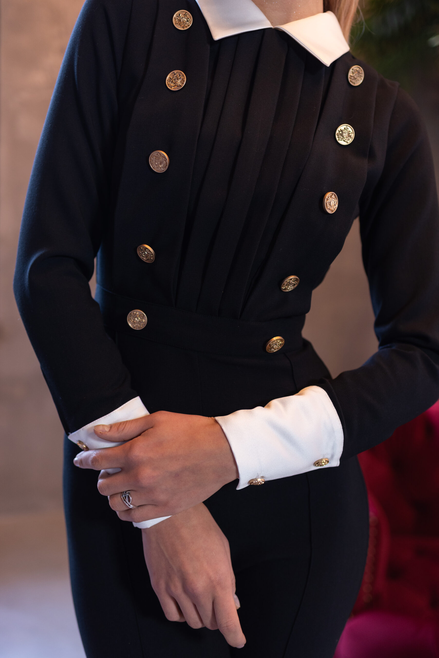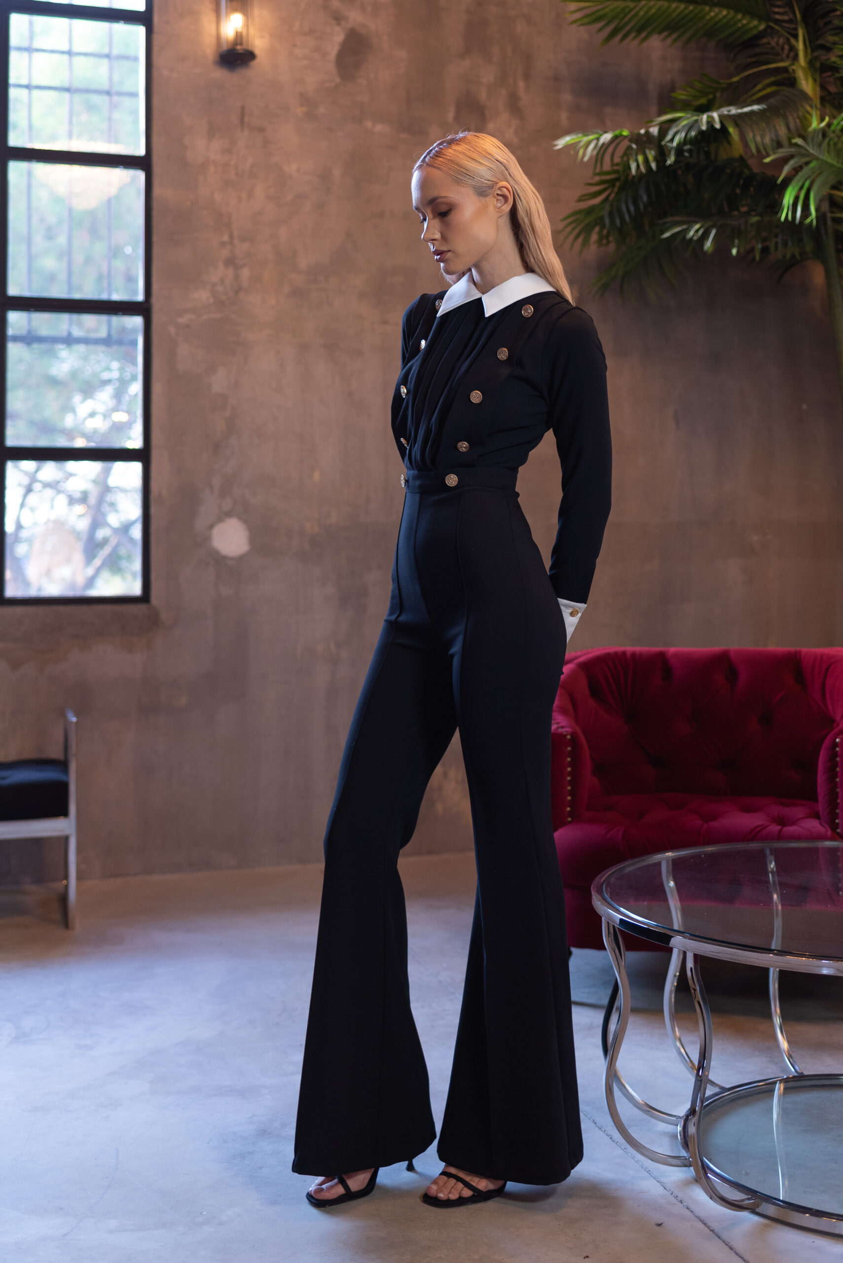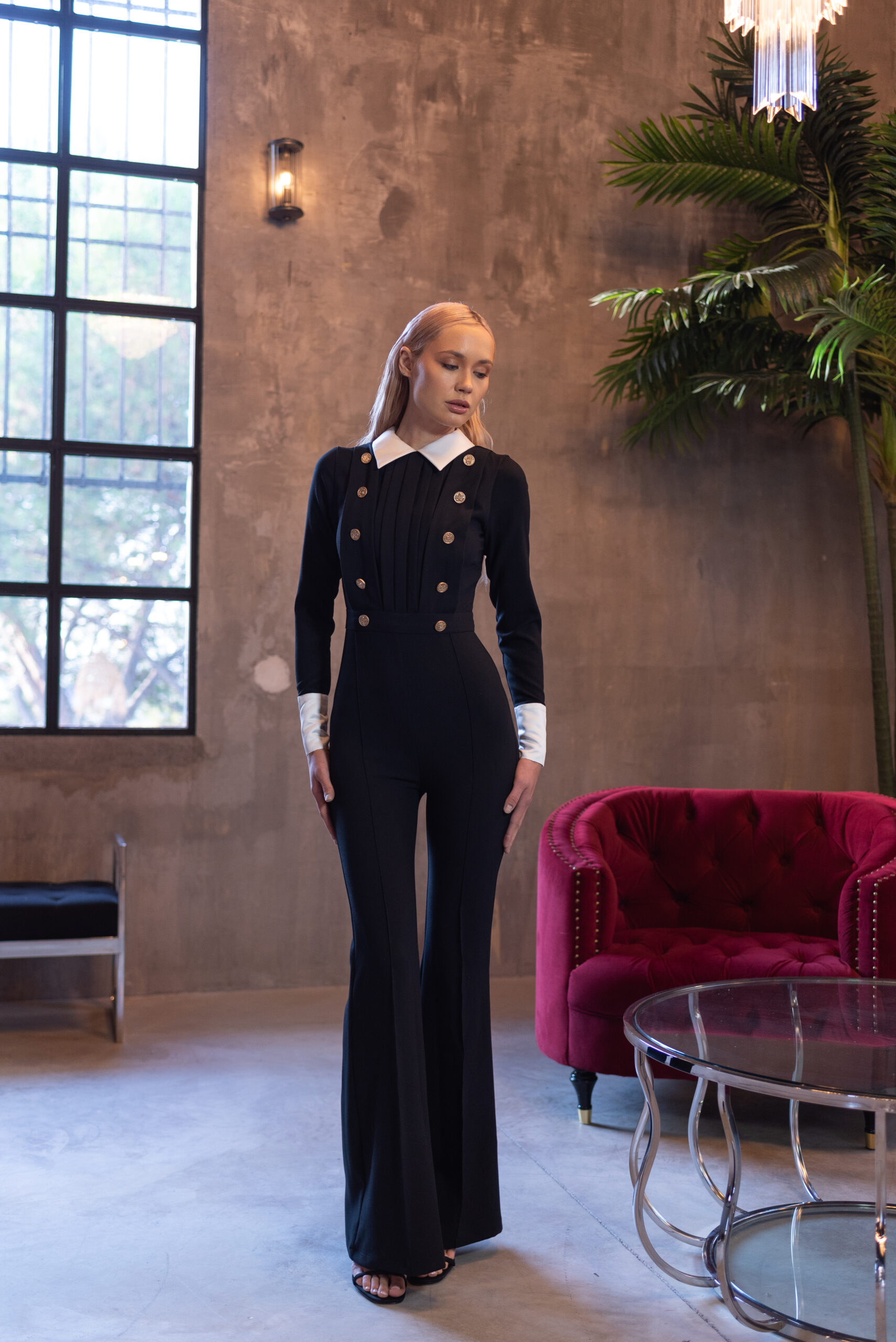 El mono GRACE es una elegante prenda en crep negro de calidad premium con el toque sofisticado de puños y cuello en raso blanco.