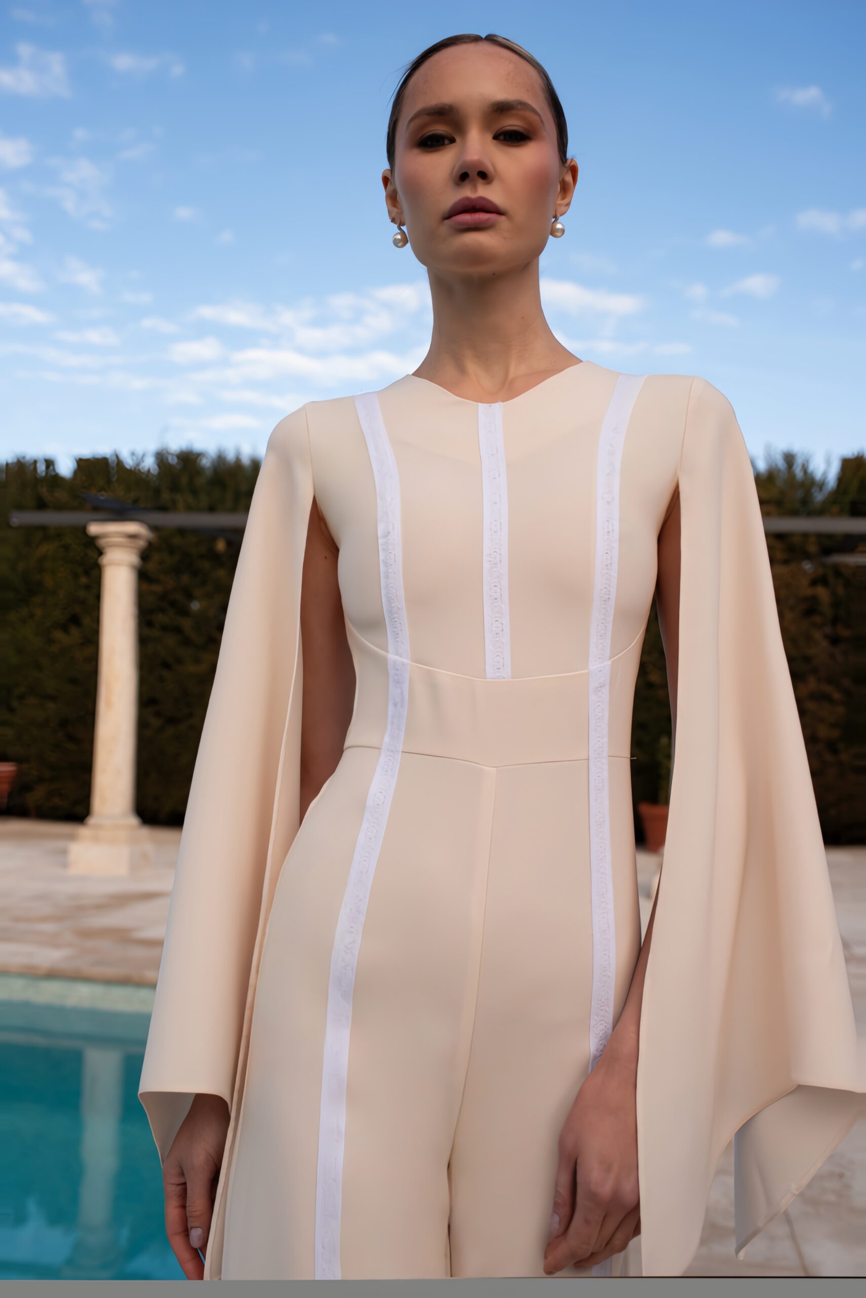 SIENNA es la delicadeza hecha mono, está realizado en crep de alta calidad color beige y gran caída.