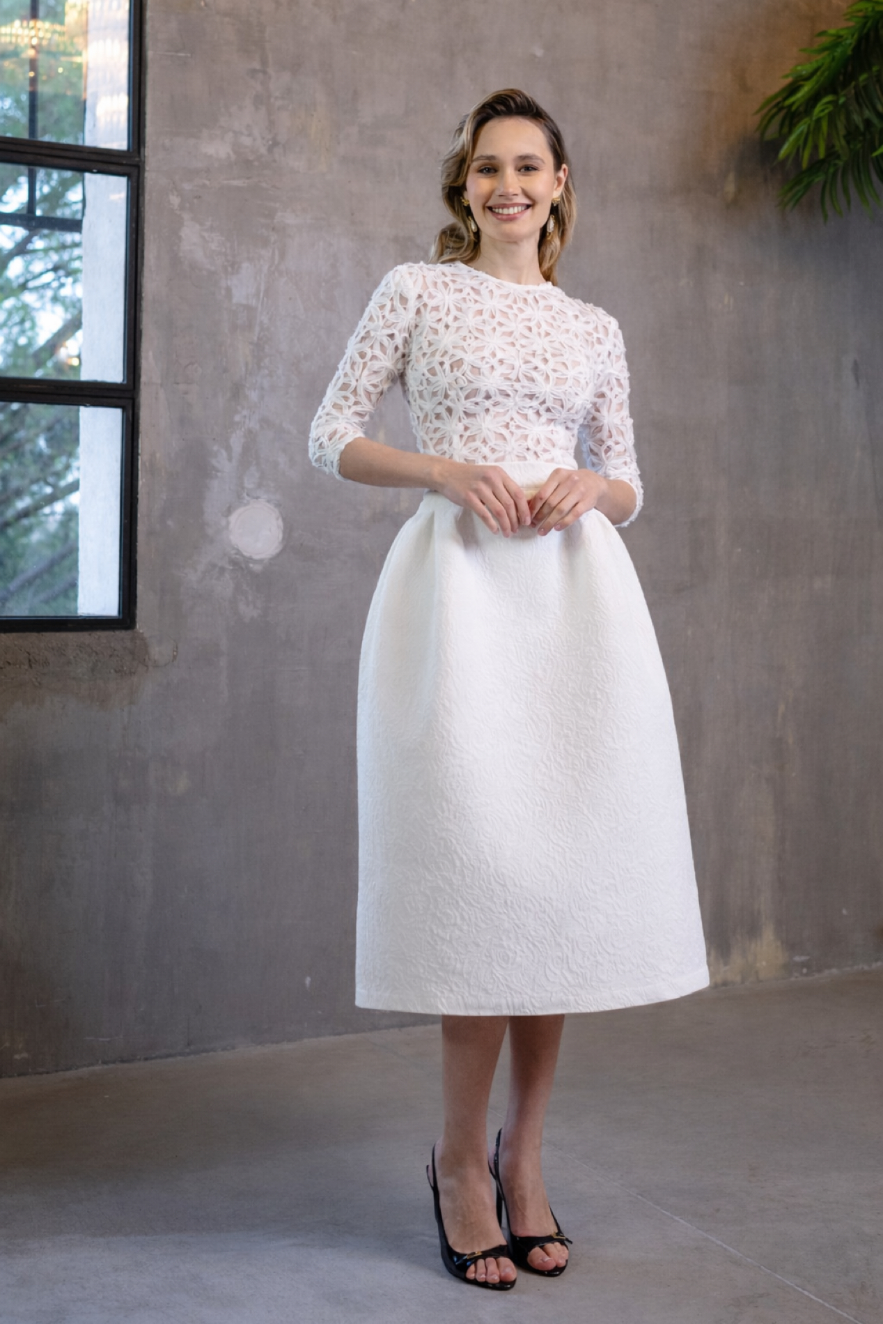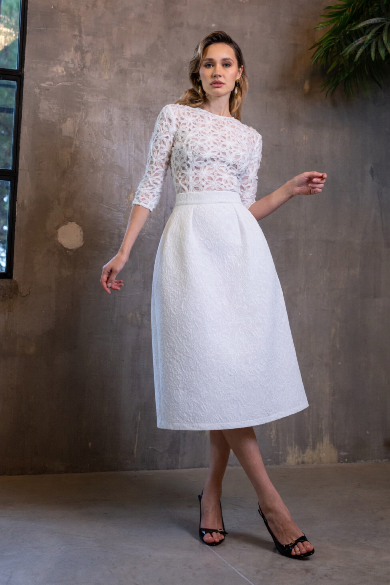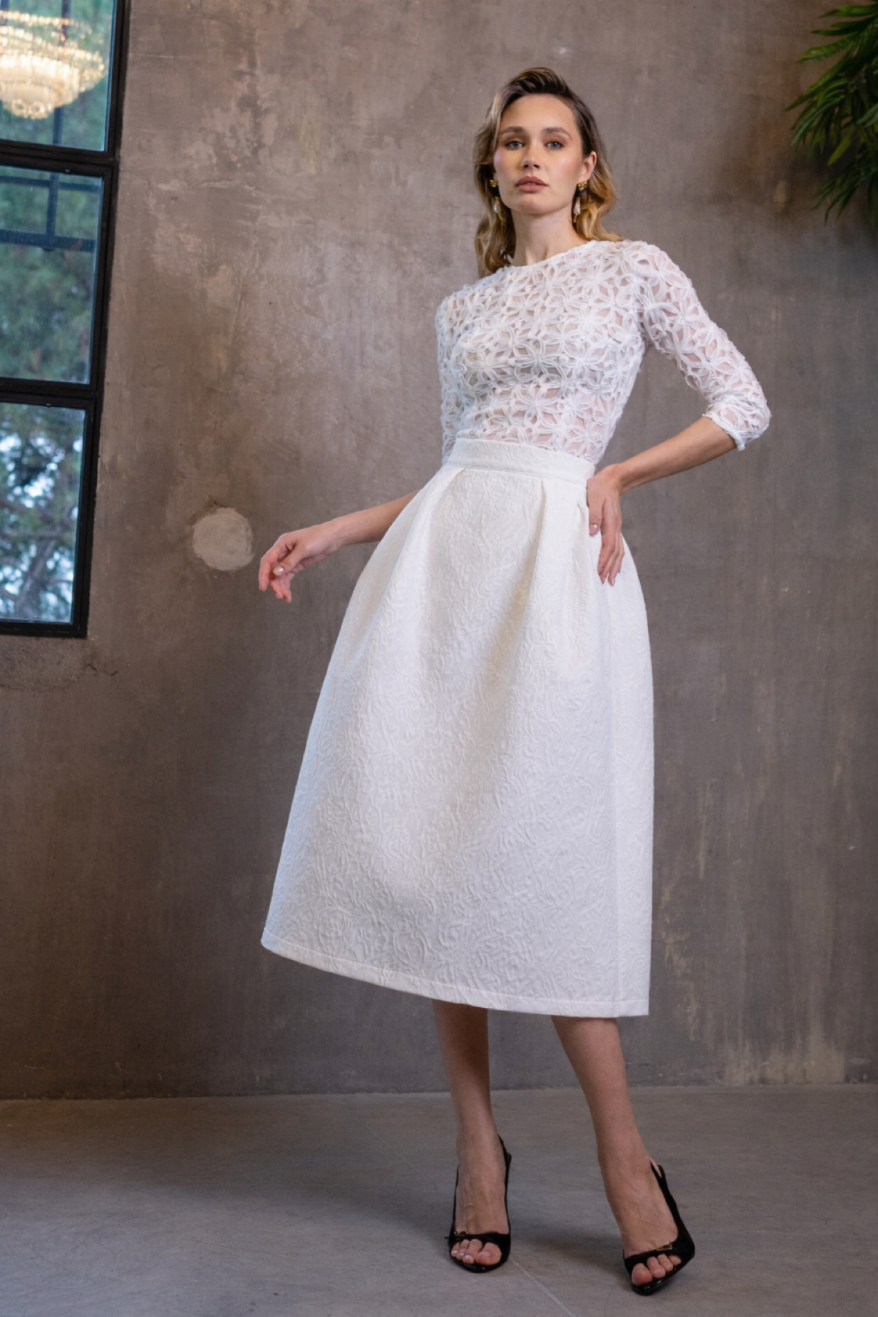 Falda midi realizada en un espectacular brocado blanco. Talle alto con generoso vuelo y mucha estructura creando un movimiento amplio y majestuoso. Bolsillos laterales.