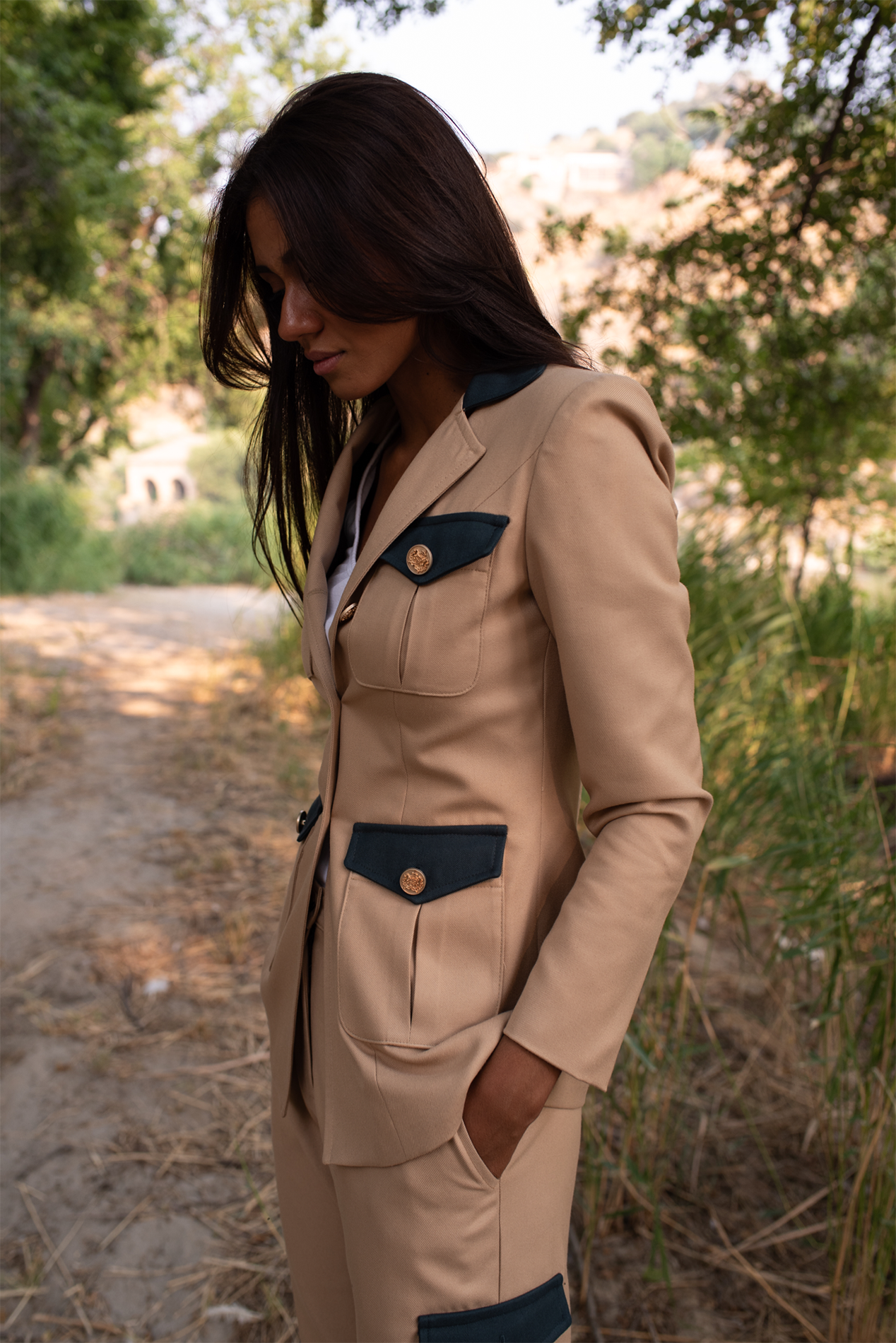 Bolsillos laterales de solapa en contraste con verde botella y cierre con botón de escudo antiguo.