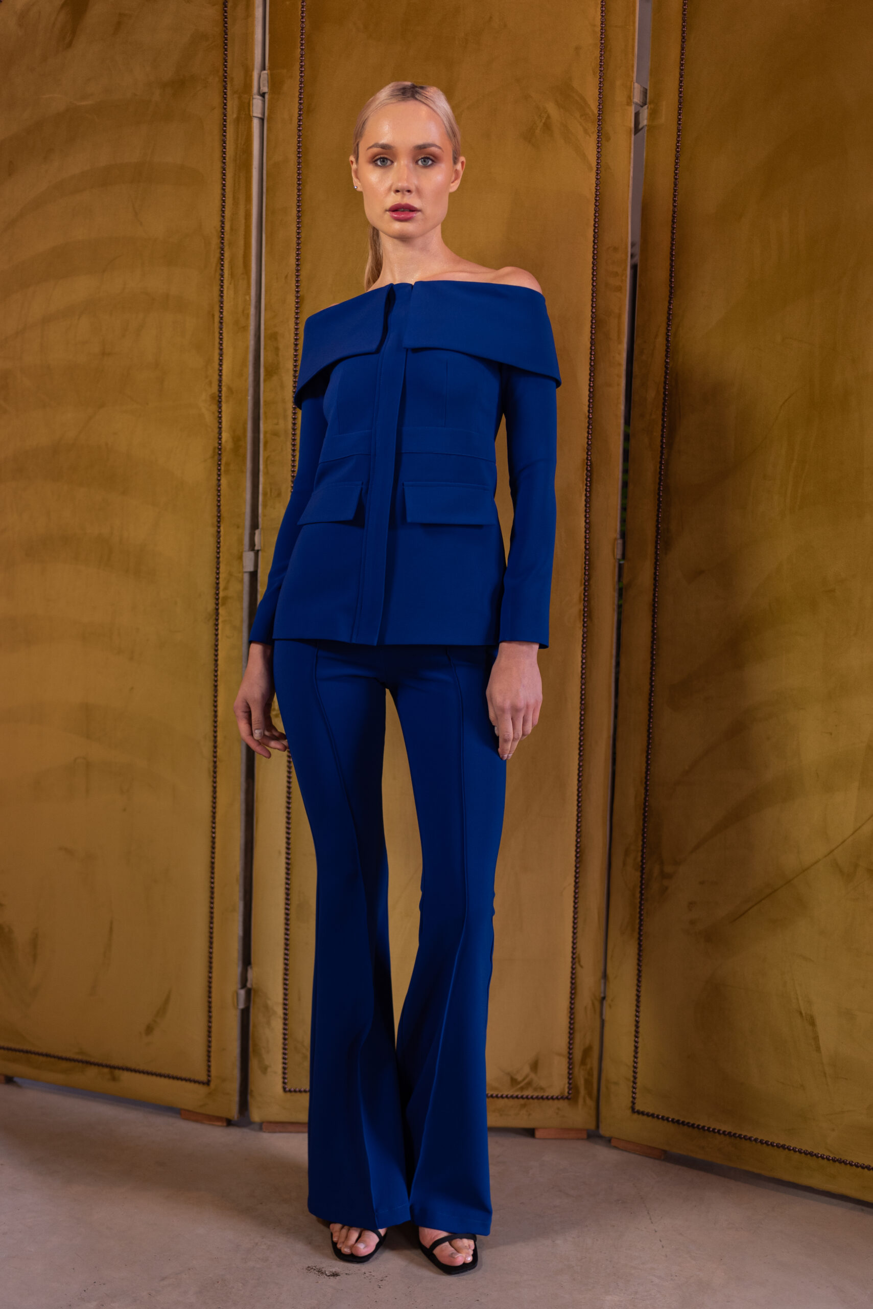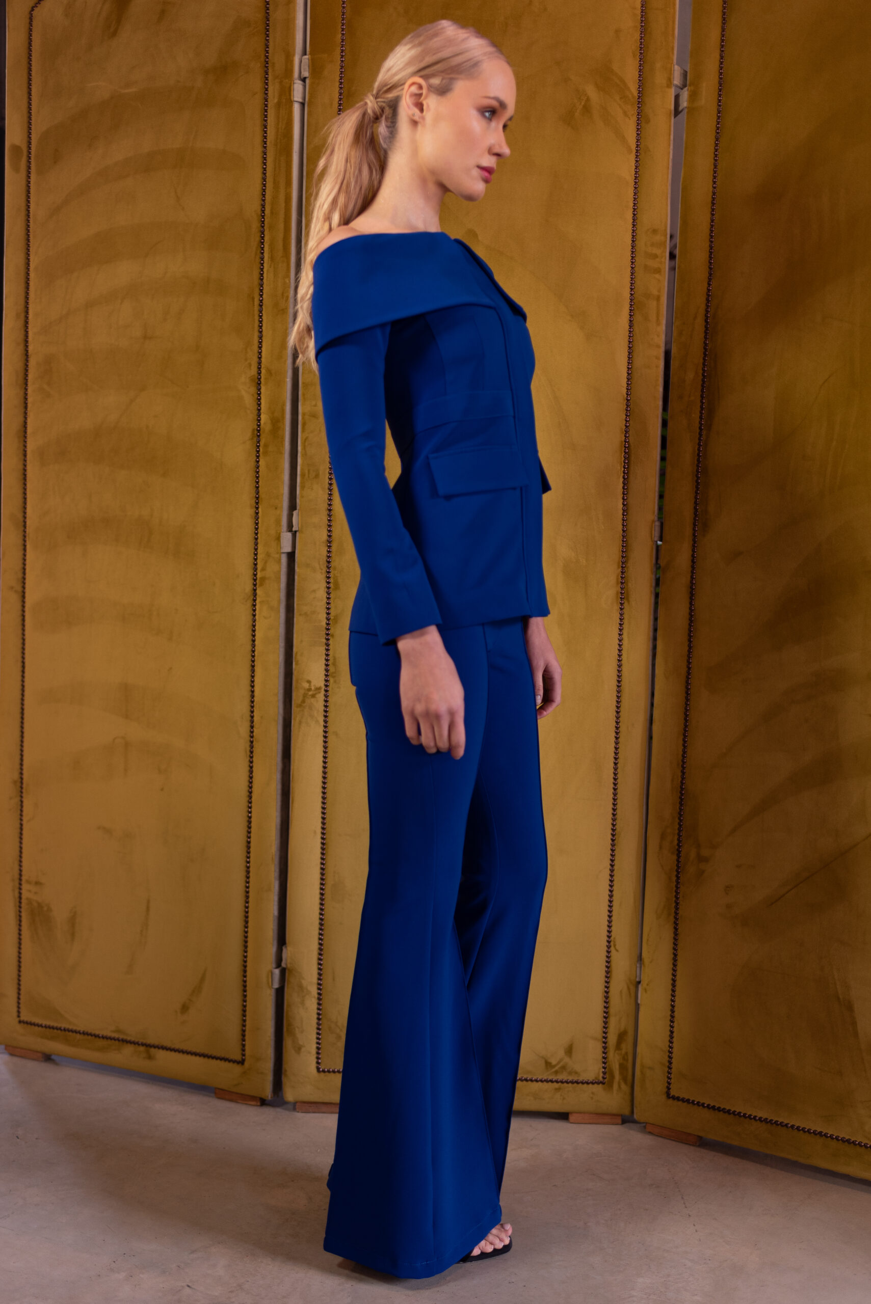 La blazer KLEIN está realizada en un espectacular crep elástico color azul Klein. Favorecedor escote Bardot.