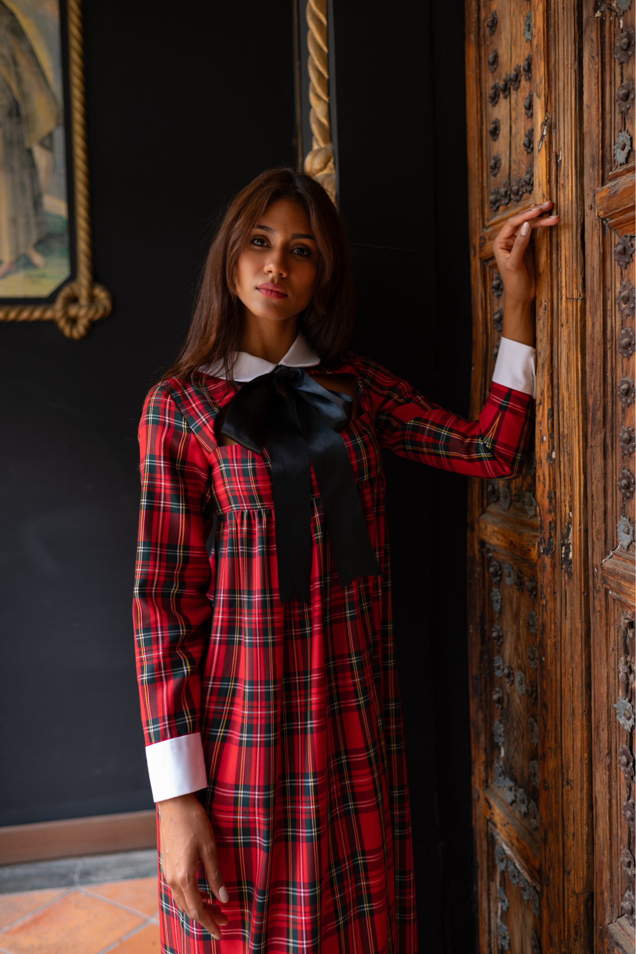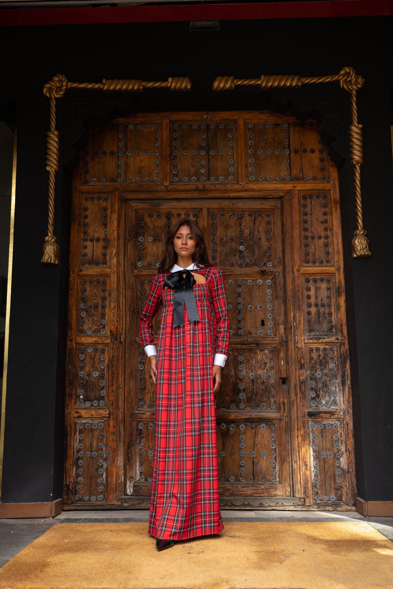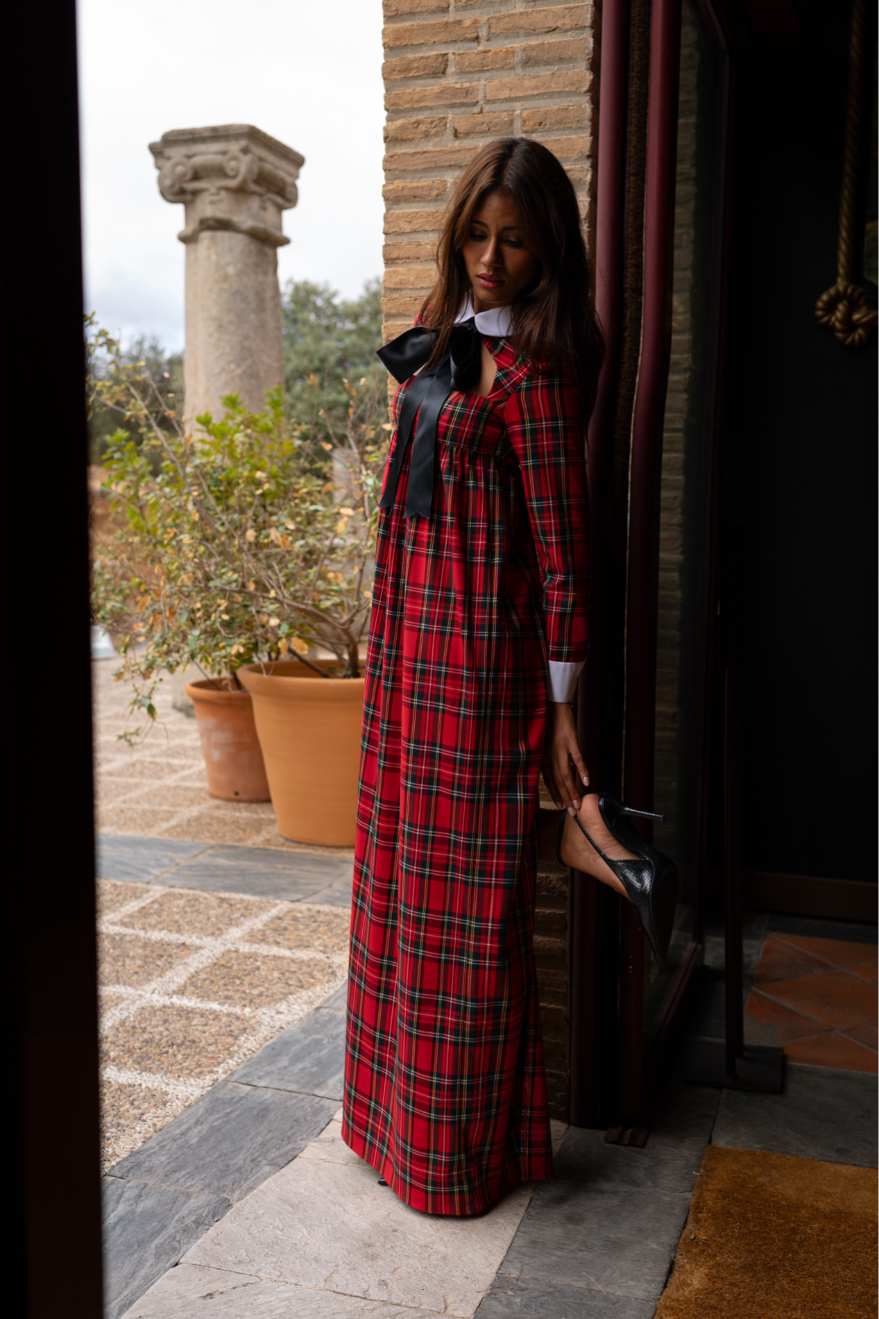 Vestido largo y con corte Baby Doll realizado en tartán escoces rojo.