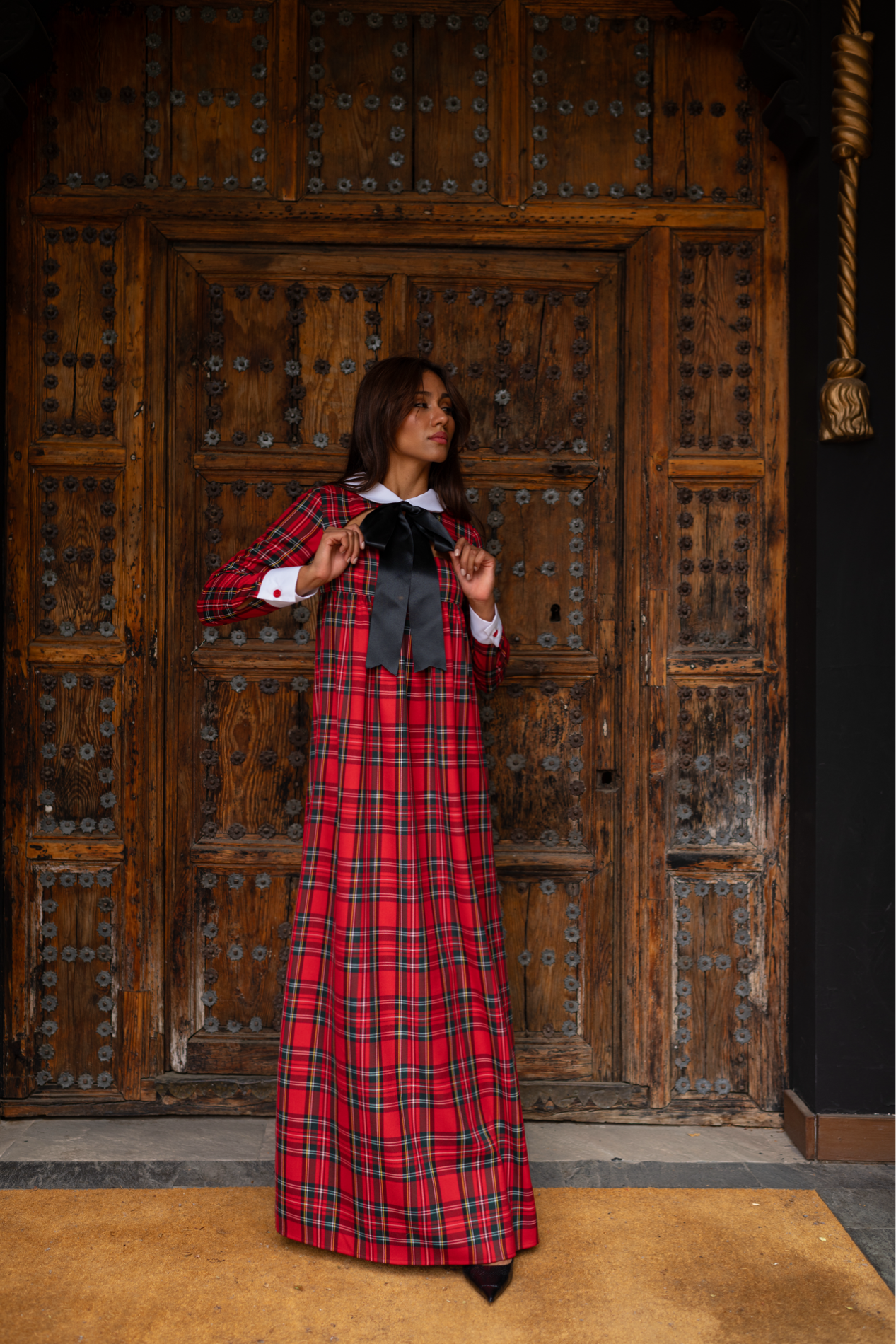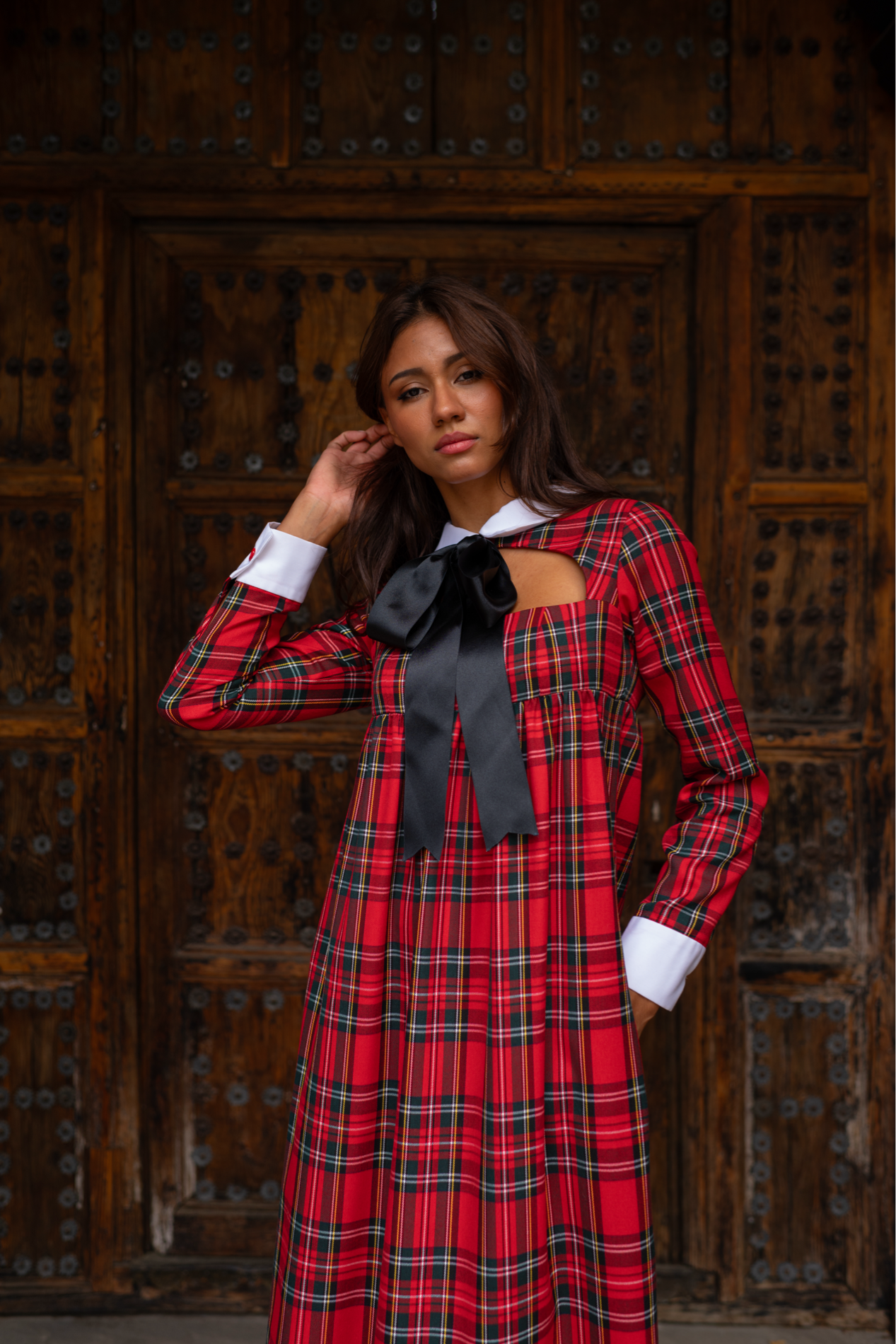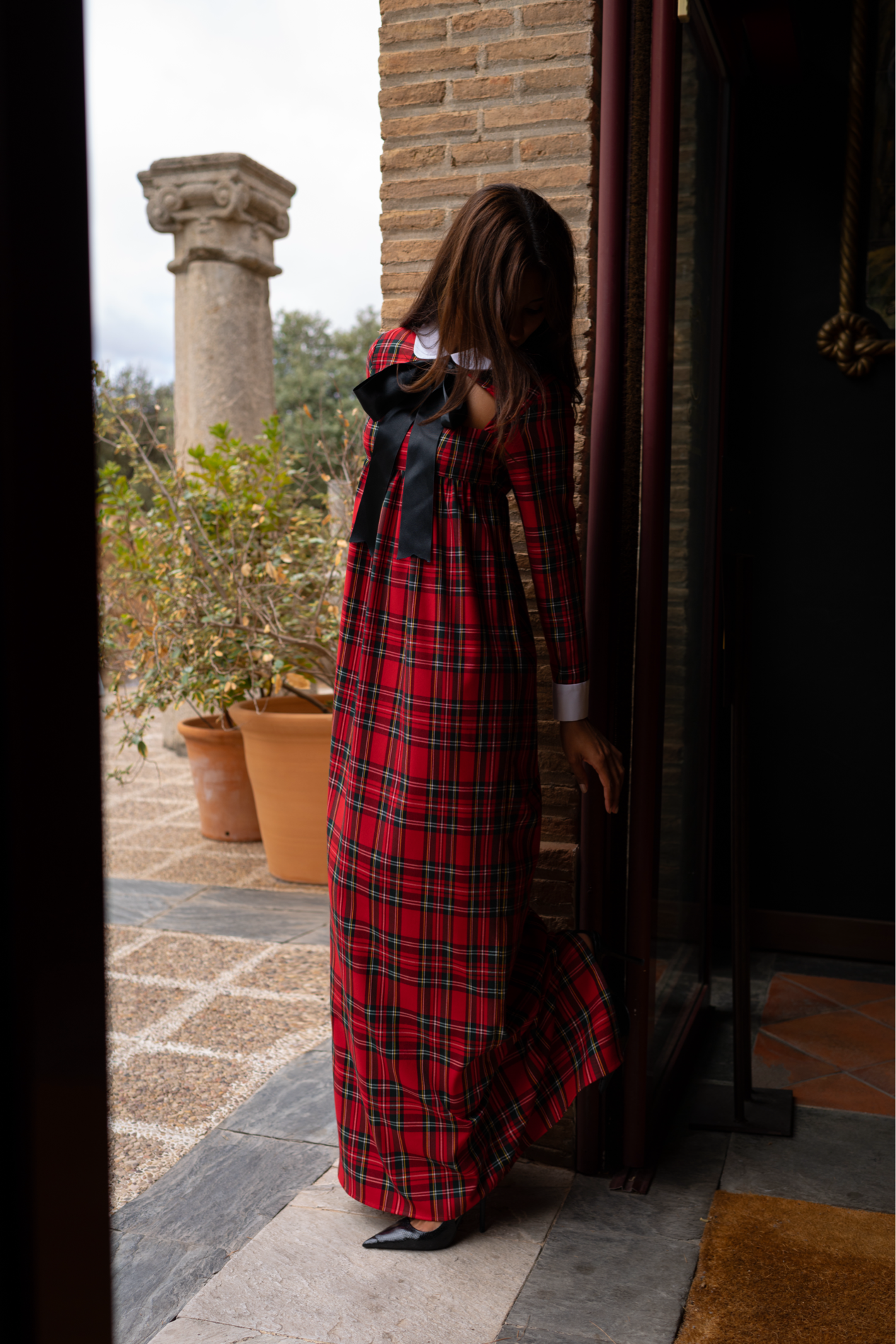Vestido largo y con corte Baby Doll realizado en tartán escoces rojo.